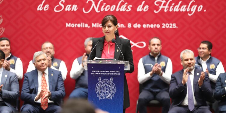 Morelia, Michoacán, 8 de enero de 2025.- “México vive una transformación social y educativa, el trabajo coordinado entre federación, estado y autoridades nicolaitas, hoy hacen realidad la Reforma Constitucional que brinda un presupuesto suficiente a la Universidad Michoacana de San Nicolás de Hidalgo (UMSNH)”, celebró la secretaria de Educación, Gaby Molina.