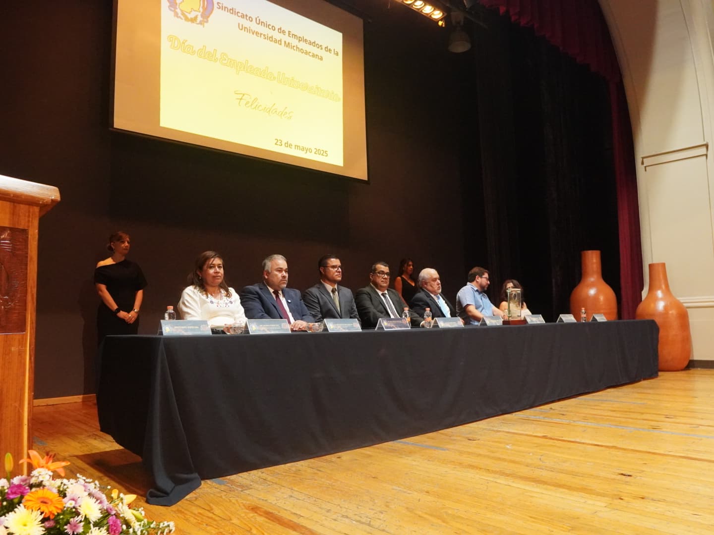 “Justo es honrarlos en su día”, destacó la diputada por el Distrito de Puruándiro, durante el acto conmemorativo por el Día del Empleado, encabezado por Eduardo Tena Flores, secretario general del Sindicato Único de Empleados de la Universidad Michoacana (SUEUM), y por Elías Ibarra Torres, coordinador de gabinete del Gobierno de Michoacán, quien llevó la representación del gobernador Alfredo Ramírez Bedolla.