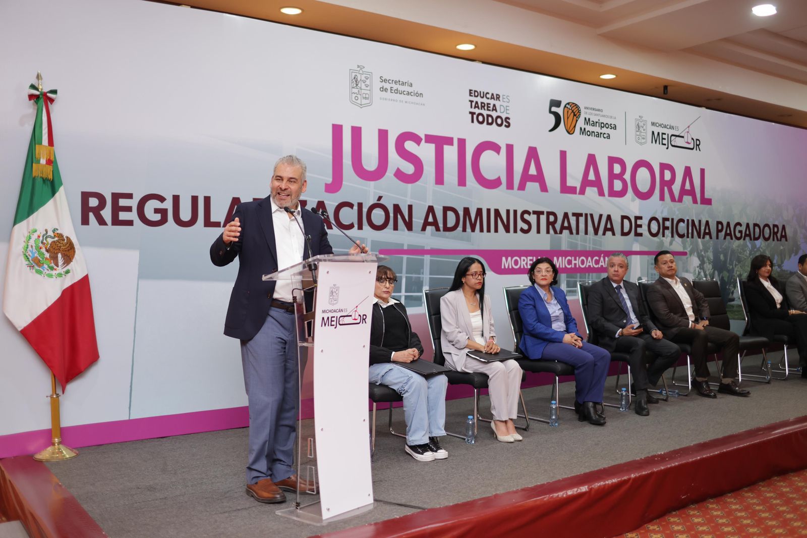 El mandatario reconoció que, a su llegada, el Gobierno de Michoacán acumulaba una gran deuda con el magisterio, pero que ahora, con la consigna de trabajar con honestidad, administrar con eficiencia y combatir la corrupción su administración ha puesto fin a más de 20 años de desorden financiero y se les ha regresado la seguridad social con el ISSSTE.