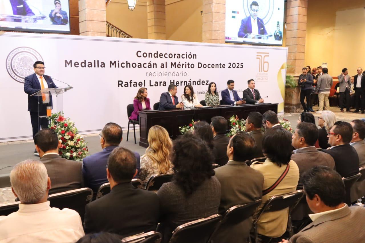 “Este Congreso, en representación del pueblo de Michoacán, honra hoy a un docente cuya trayectoria no solo es destacada, sino profundamente formativa e inspiradora. Me refiero al doctor Rafael Lara Hernández, ejemplo de vocación, de innovación y de compromiso con la transformación educativa desde la raíz de nuestras instituciones públicas”, aseveró.