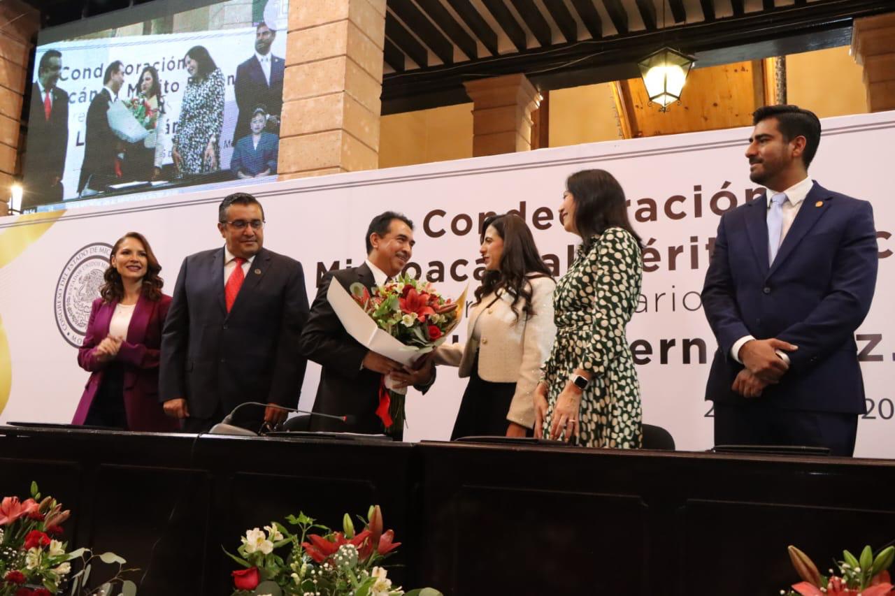La diputada Giuliana Bugarini Torres, presidenta de la Mesa Directiva del Congreso del Estado, señaló que esta condecoración, reafirma el papel de la educación como piedra angular del desarrollo de Michoacán.