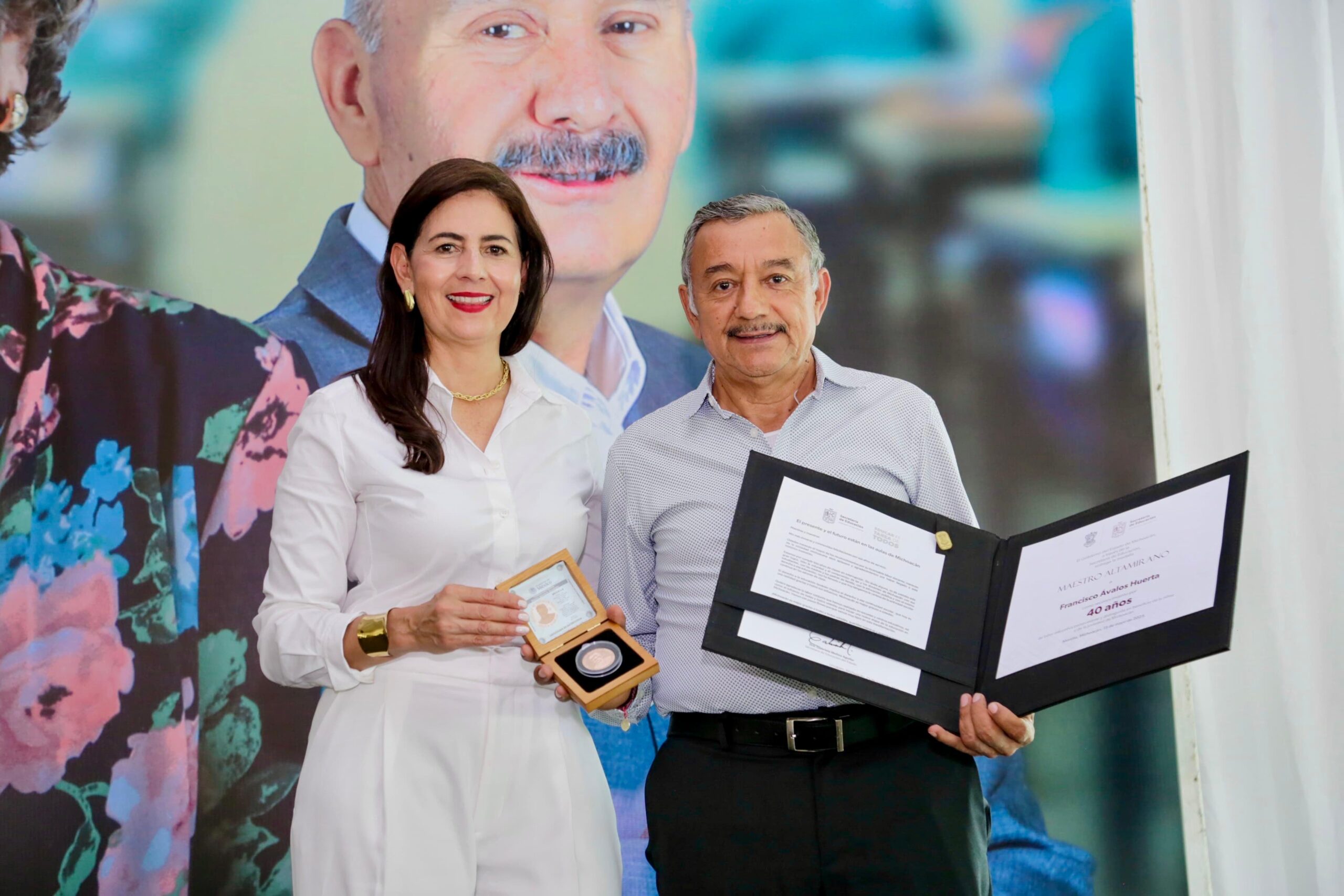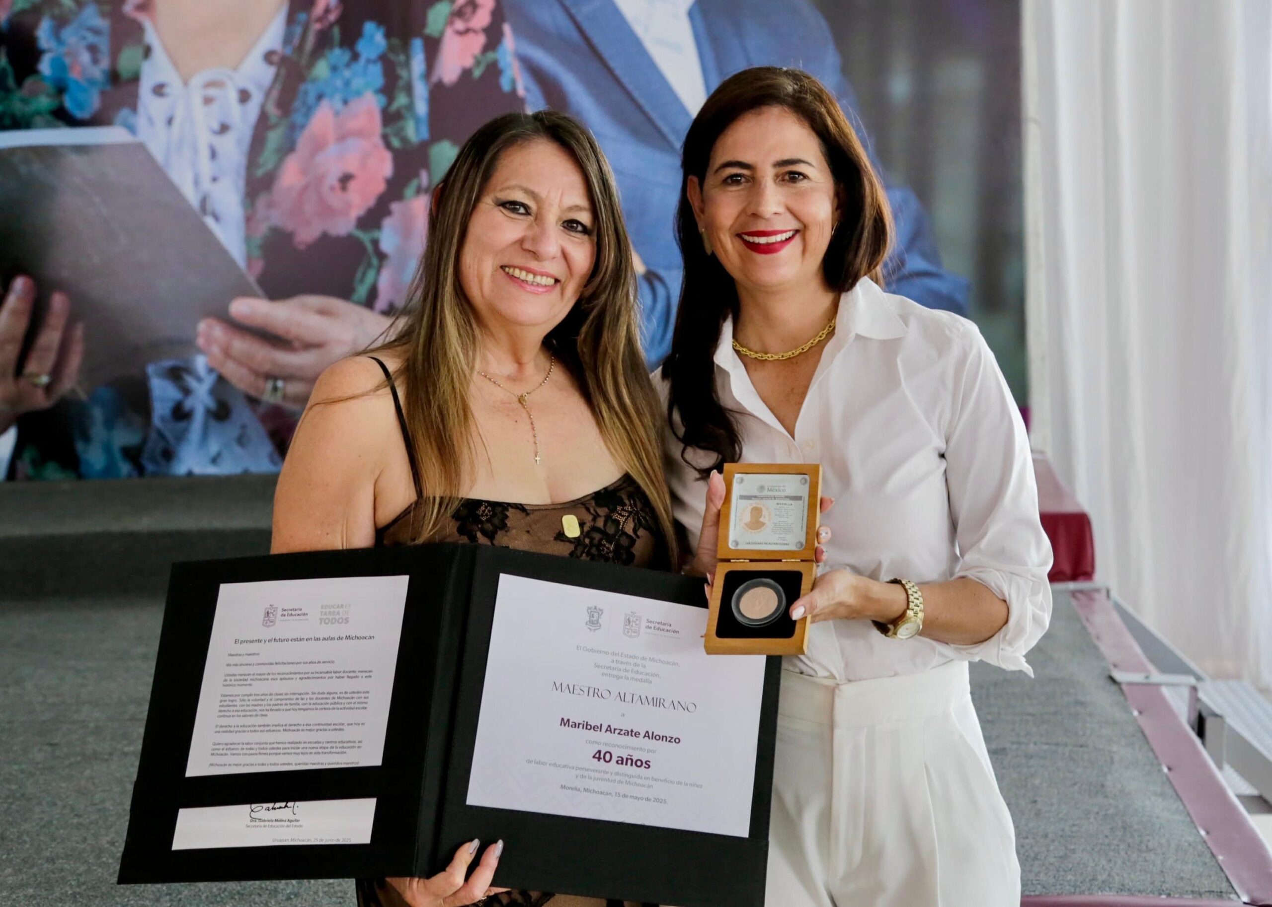 Morelia, Michoacán, 26 de junio de 2025.-Maestras y maestros galardonados por más de tres o cuatro décadas de servicio destacaron su labor en las aulas como un factor elemental para la transformación de la sociedad, en el evento encabezado por el gobernador Alfredo Ramírez Bedolla y la secretaria de Educación Gaby Molina, que se llevó a cabo en Uruapan.