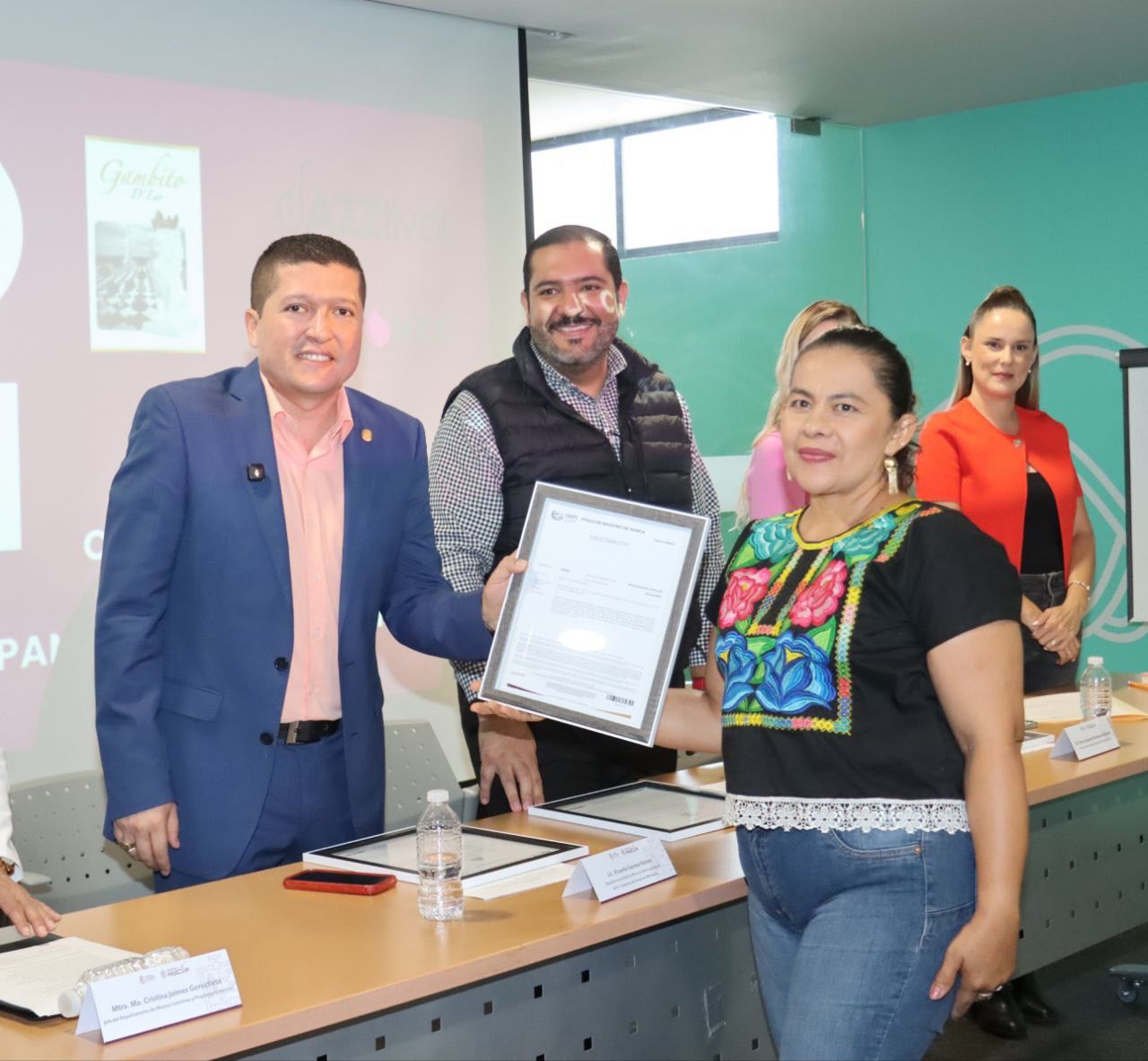 En compañía del subsecretario de Comercio Internacional, Eduardo Norberto Ramírez Canals; y, la jefa del Departamento de Marcas Colectivas y Propiedad Industrial, María Cristina Jaimes Goroztieta, felicitó a las y los emprendedores que recibieron sus títulos, particularmente a las personas creadoras de las marcas Paropan y ChocoArleth, pertenecientes al Distrito XIX.