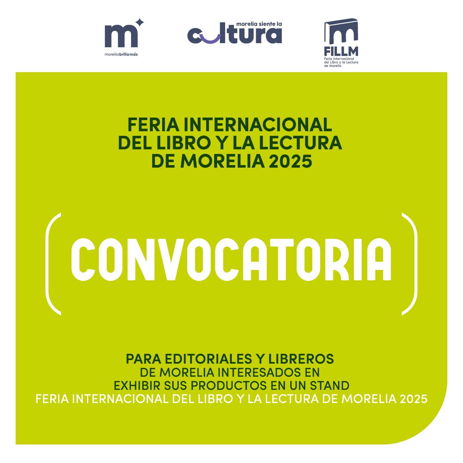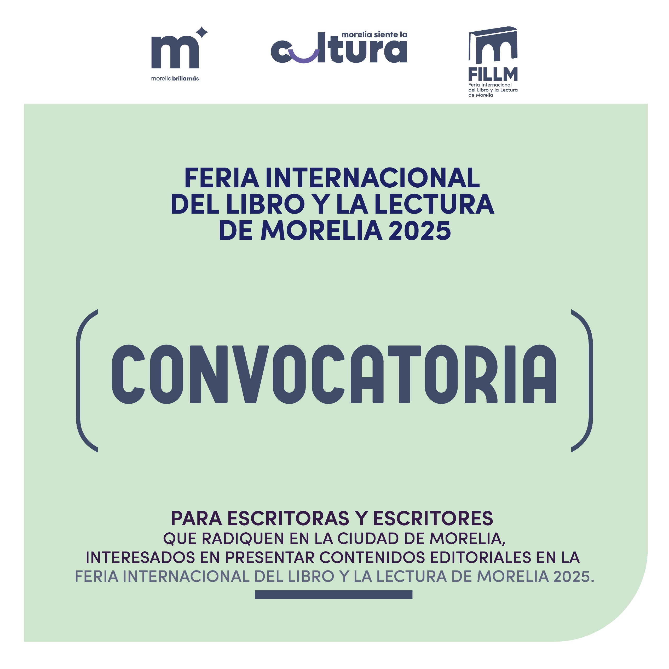 Tanto la Convocatoria para escritoras y escritores radicados en Morelia e interesados en presentar contenidos editoriales, como la Convocatoria para editoriales y libreros de Morelia interesados en exhibir sus productos en un stand, tienen como fecha límite de registro el próximo 18 de julio. El periodo de evaluación y selección se realizará del 21 de julio al 01 de agosto, y el anuncio de editoriales, libreros y autores seleccionados se hará del 04 al 08 de agosto. Para más información, los libreros y editoriales locales pueden escribir al correo expositoresfillm25@gmail.com; y las y los autores locales pueden ponerse en contacto a través de programacionfillm25@gmail.com.