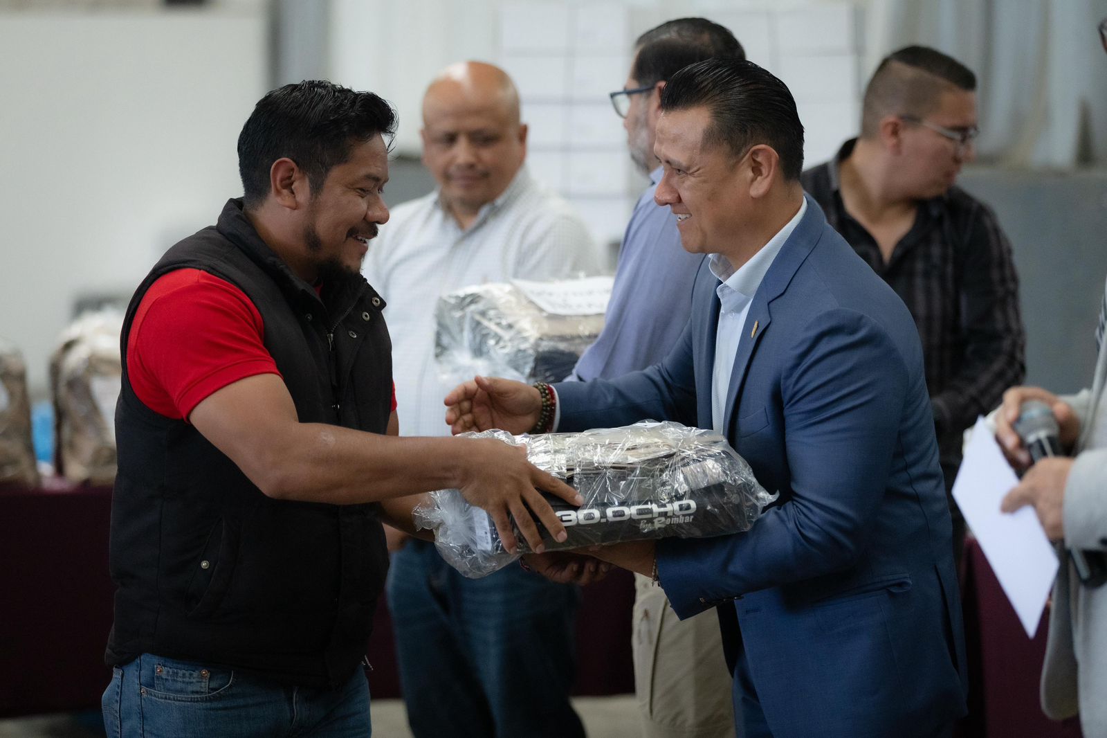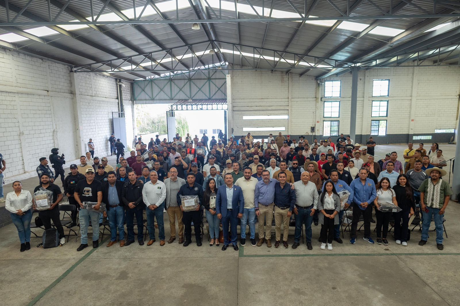 Acompañado por el secretario de Seguridad Pública, Juan Carlos Oseguera Cortés, el encargado de la política interna, a nombre del gobernador Alfredo Ramírez Bedolla, entregó paquetes con botas, camisas y pantalones especialmente diseñados para sus labores de seguridad, a las y los representantes de los cuerpos de vigilancia de las comunidades.