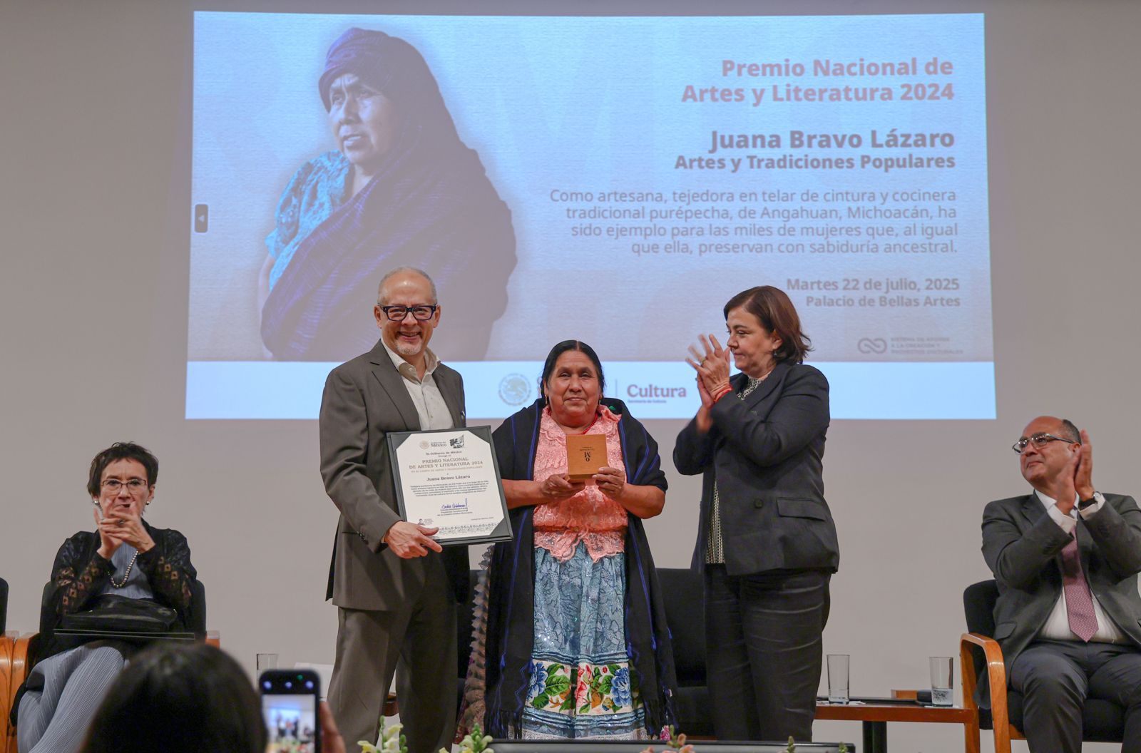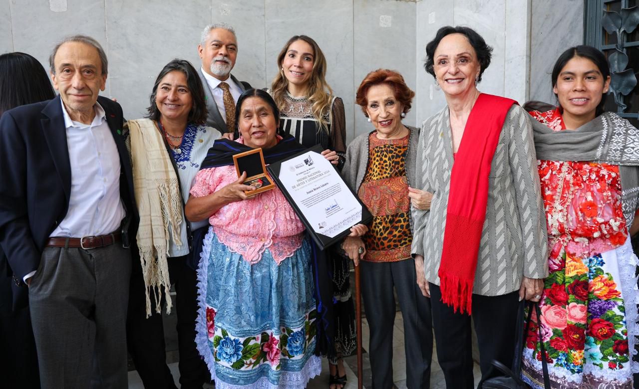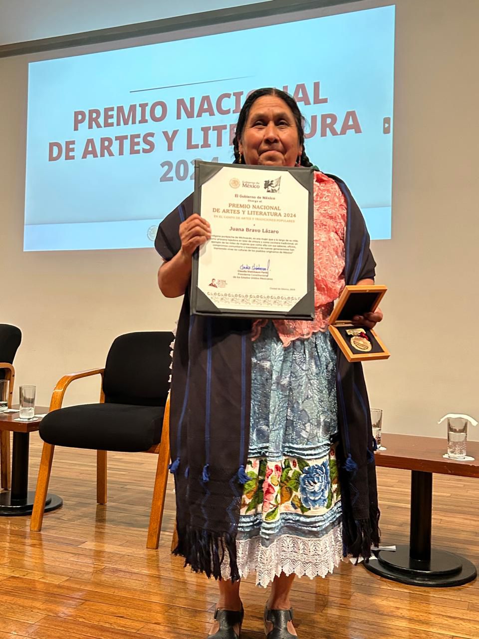 Ciudad de México, México.- La maestra cocinera tradicional y maestra artesana, Juana Bravo Lázaro, recibió este día el Premio Nacional de Artes y Literatura 2024, en la categoría de Artes y Tradiciones Populares, teniendo como escenario el Palacio de Bellas Artes, en la Ciudad de México.