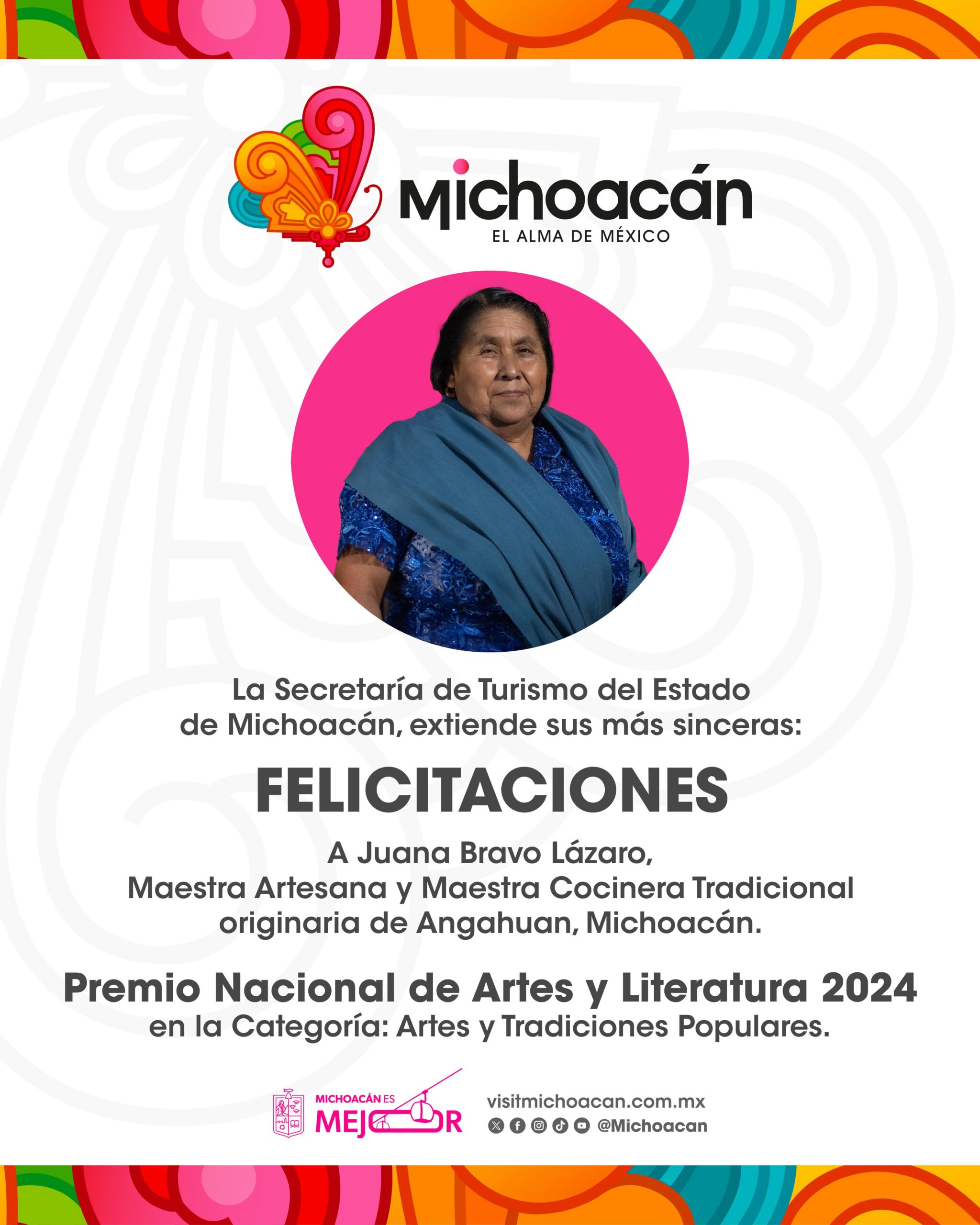 Tras el galardón a Juana Bravo Lázaro, la Sectur Michoacán extiende una invitación especial a turistas nacionales e internacionales para que descubran la riqueza cultural y gastronómica de la entidad, un viaje a “el alma de México” que se vive a través de sus sabores.