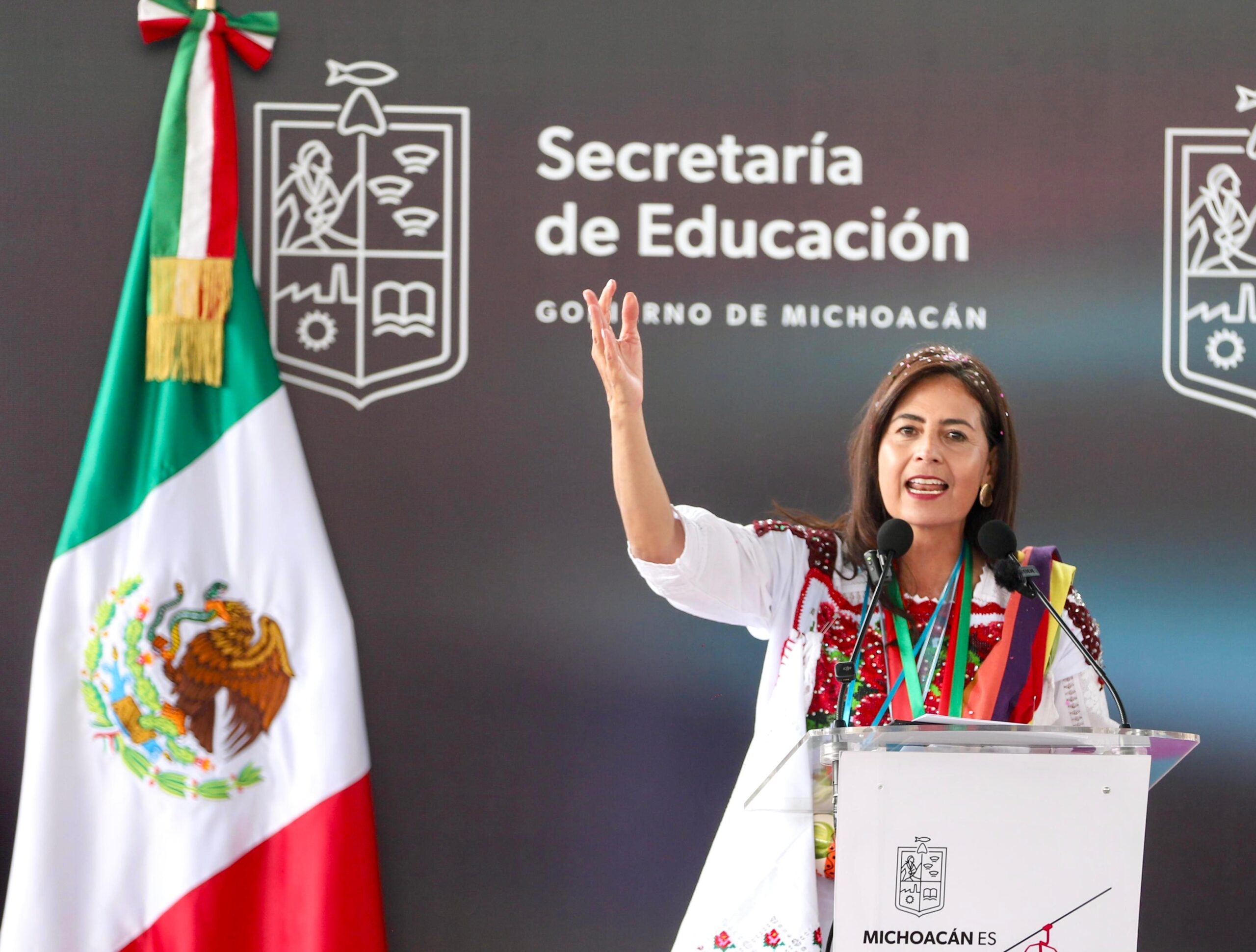 En la secundaria Lázaro Cárdenas, de Paracho, refrendó su compromiso con la transformación del estado: “Tenemos presente y tenemos futuro. Sabemos dónde estamos, pero sobre todo sabemos a dónde vamos. Estamos viviendo la mayor transformación educativa en la historia de Michoacán”.