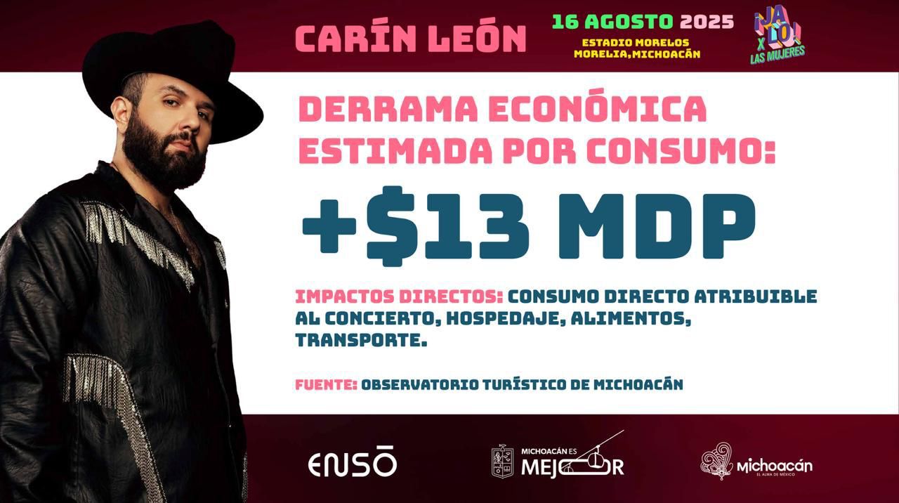 El concierto de Carín León dejará una derrama económica superior a los 13 millones de pesos entre hospedaje, consumo de alimentos y transporte para la capital michoacana, así lo señaló el gobernador Alfredo Ramírez Bedolla.