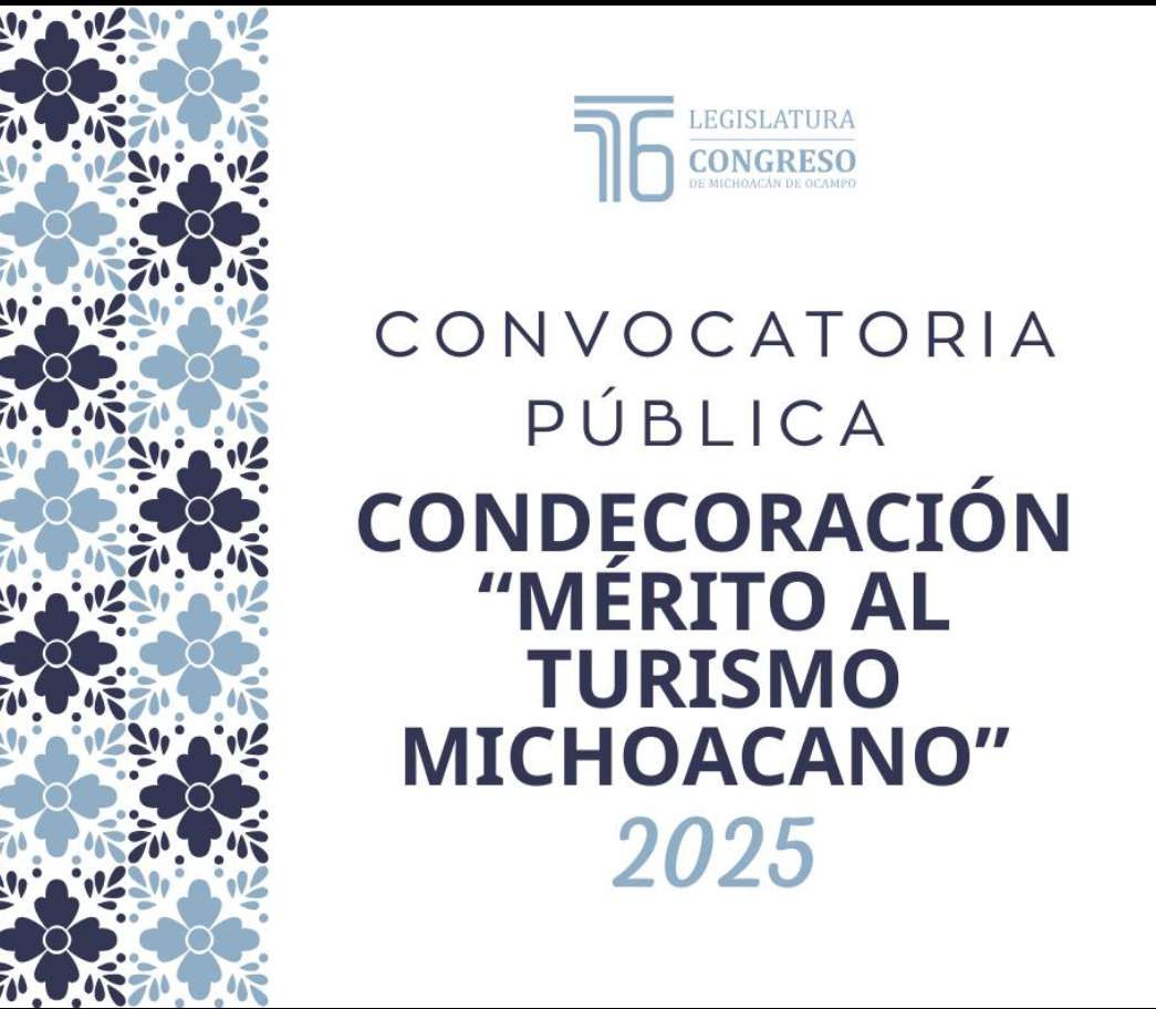 La Convocatoria para la entrega de la Condecoración “Mérito al Turismo Michoacano”, en su edición 2025, puede consultarse en: https://congresomich.site/wp-content/uploads/2025/08/CONVOCATORIA-PARA-LA-CONDECORACION-MERITO-AL-TURISMO-MICHOACAN-2025.pdf