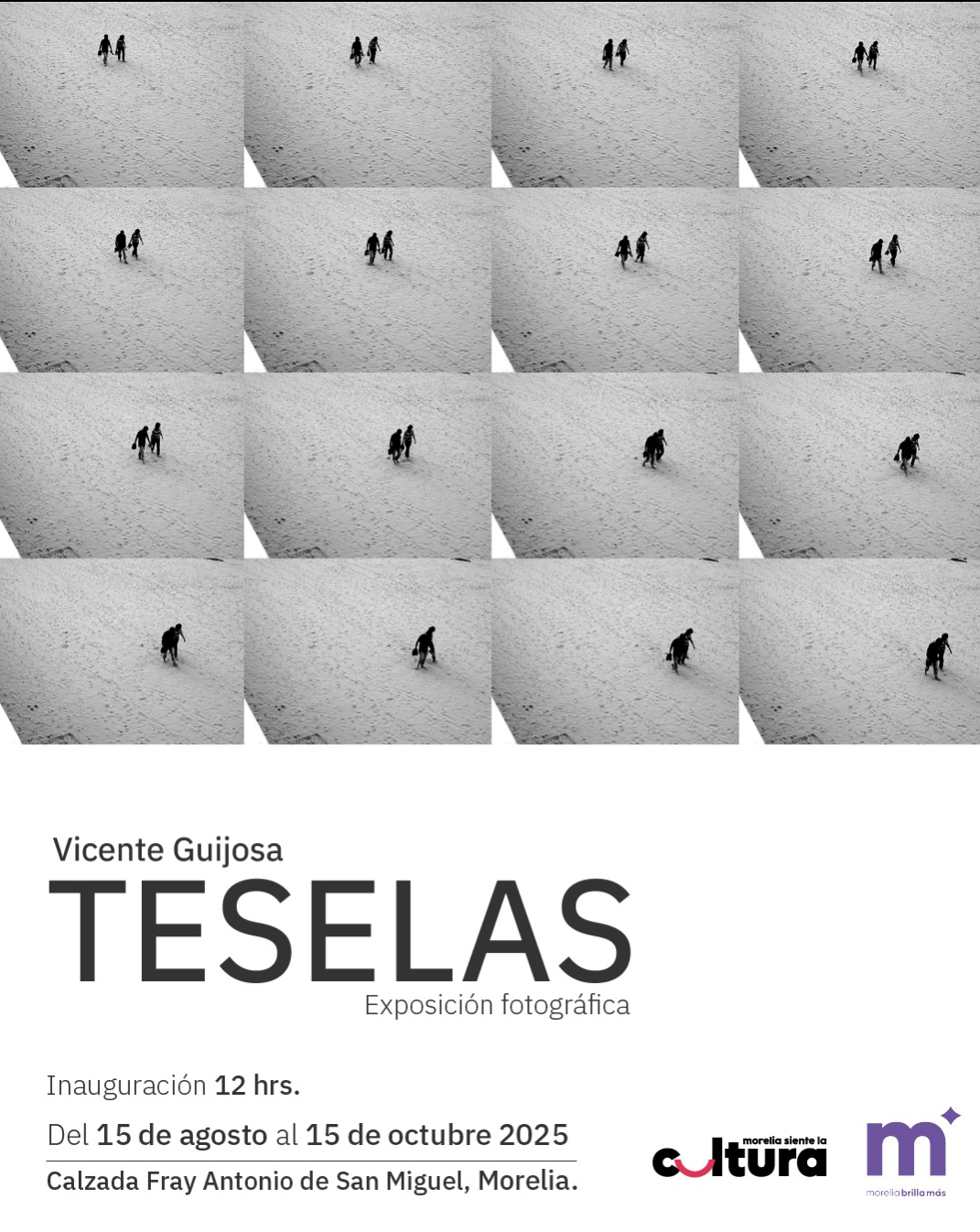 Morelia, Michoacán; 12 de agosto de 2025.- El Gobierno de Morelia que encabeza el presidente municipal, Alfonso Martínez Alcázar, por medio de su Secretaría de Cultura (SeCultura) invita a disfrutar de la inauguración de la exposición fotográfica “Teselas” de Vicente Guijosa, este viernes 15 de agosto a las 12:00 horas, en la calzada Fray Antonio de San Miguel.