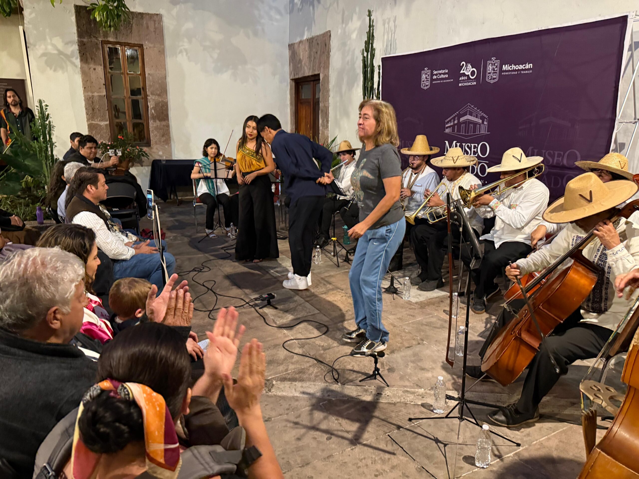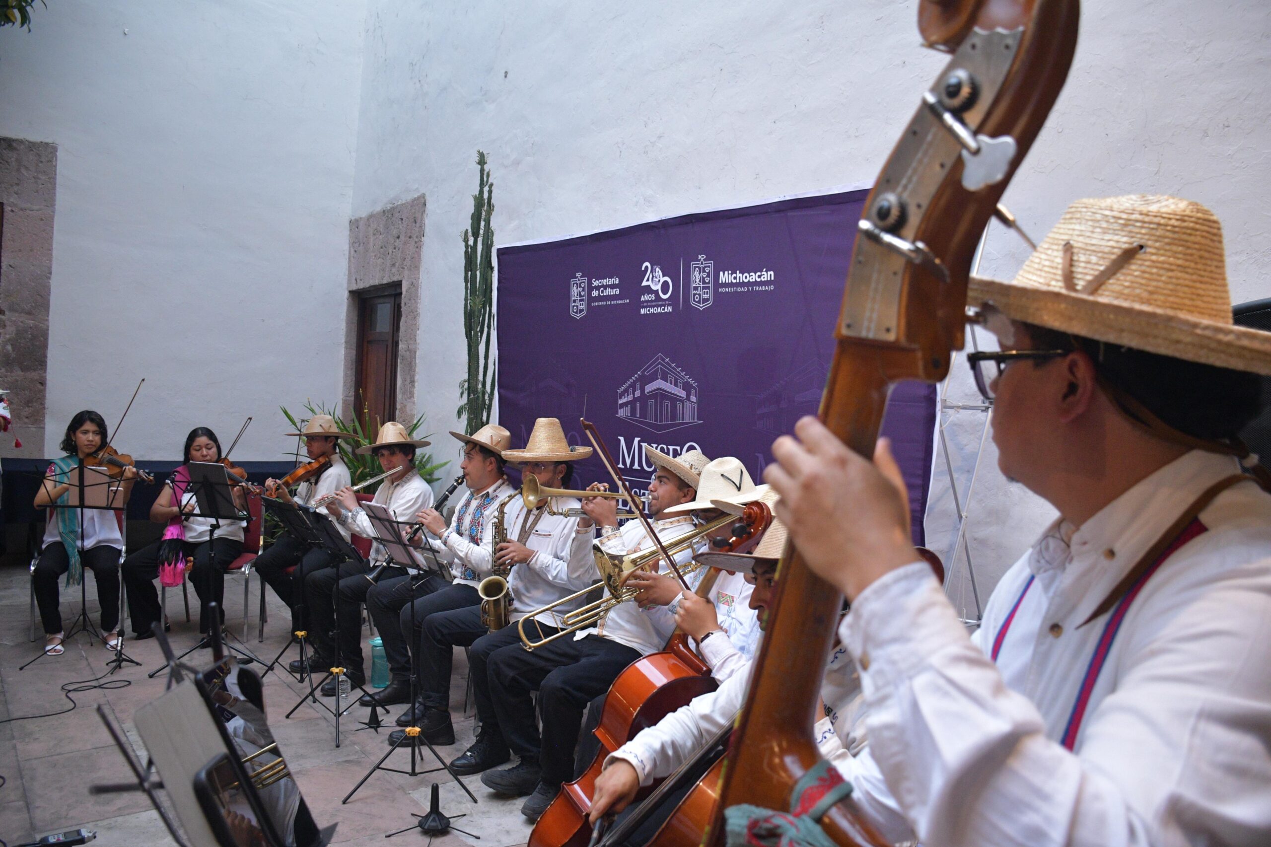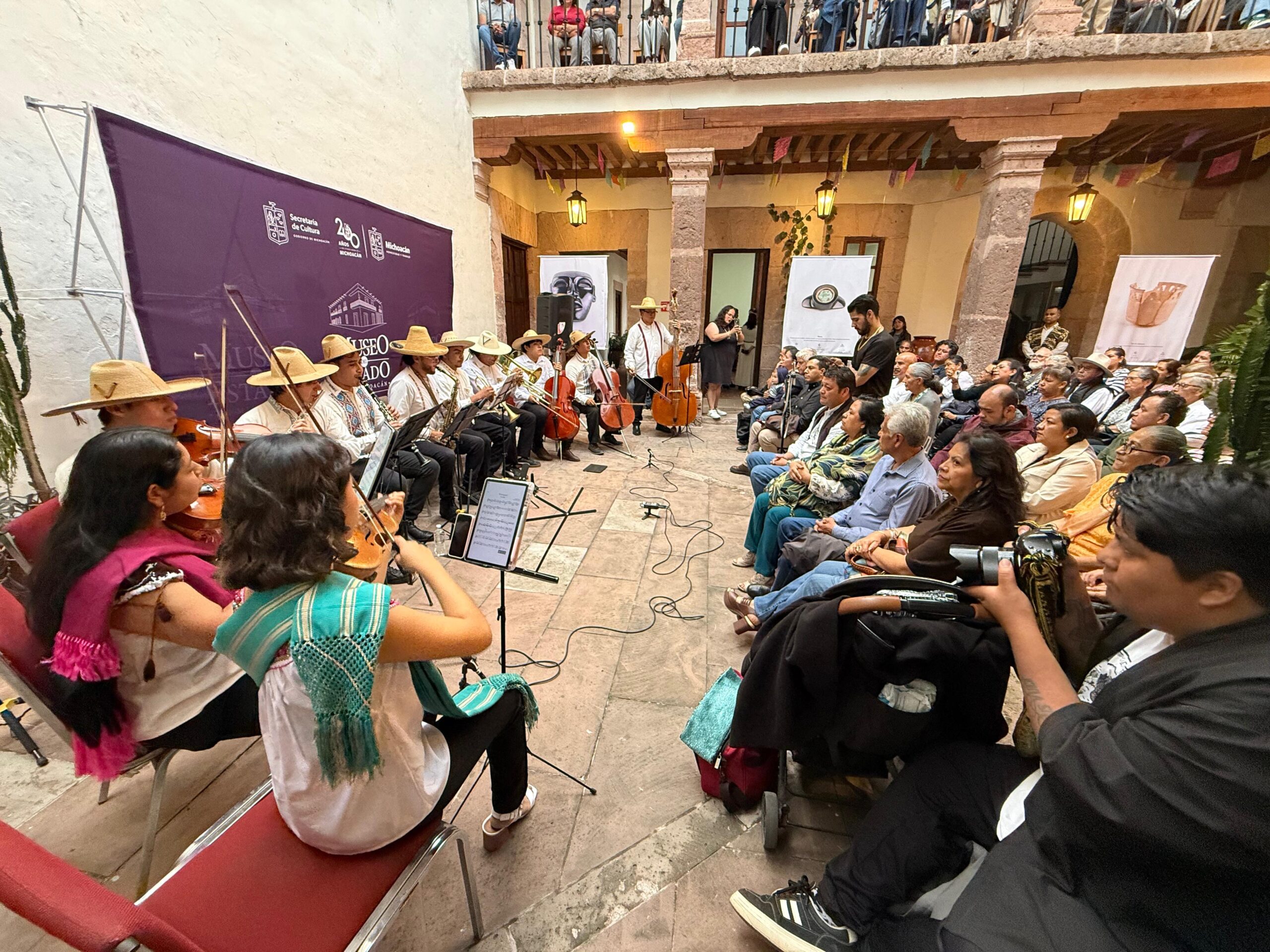 Morelia, Michoacán, 14 de agosto de 2025.- El Museo del Estado de Michoacán (MEM) celebró su 39 aniversario con una velada que unió historia, música y comunidad. El emblemático Patio de la Magnolia se desbordó de público para disfrutar del talento de la Orquesta Emenda Música P’urhépecha, que ofreció un viaje sonoro a través de la interpretación de sones, abajeños, pirekuas y composiciones originales.