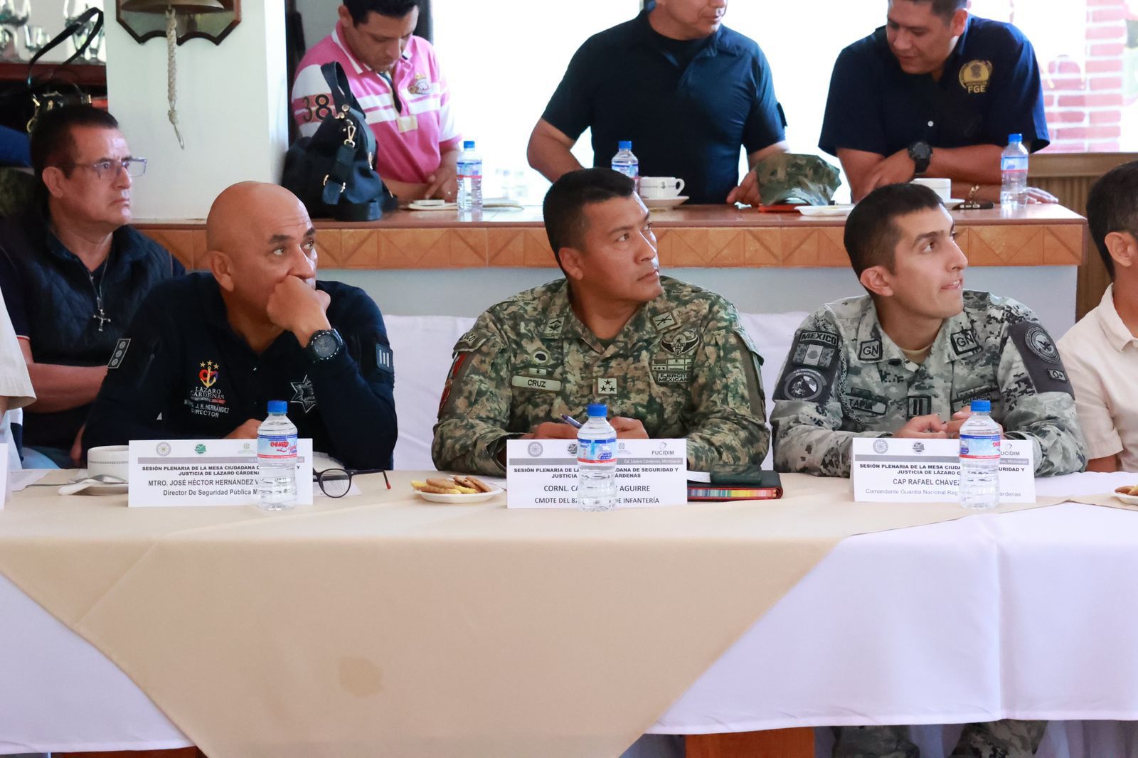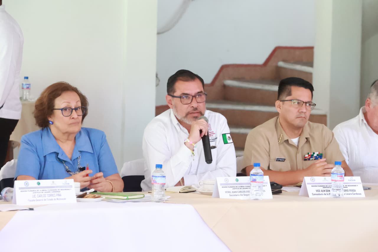 Lázaro Cárdenas, Michoacán.- Durante sesión plenaria de la Mesa Ciudadana de Seguridad y Justicia, el titular de la Secretaría de Seguridad Pública (SSP), Juan Carlos Oseguera Cortés, en conjunto con el fiscal General del Estado Carlos Torres Piña, autoridades federales y locales, establecieron acuerdos en beneficio para garantizar la paz en todo el territorio de la región de Lázaro Cárdenas.