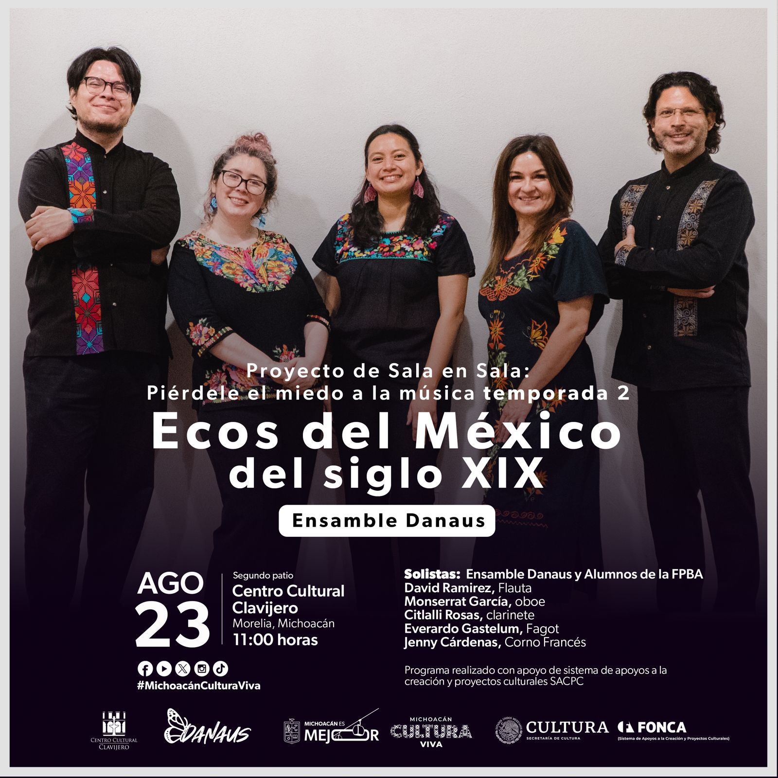 El recital estará a cargo del Ensamble Danaus, acompañado por estudiantes de la Facultad Popular de Bellas Artes de la Universidad Michoacana de San Nicolás de Hidalgo (UMSNH). En esta ocasión se contará con la participación de los solistas: David Ramírez (flauta), Monserrat García (oboe), Citlalli Rosas (clarinete), Everardo Gastélum (fagot) y Jenny Cárdenas (corno francés).