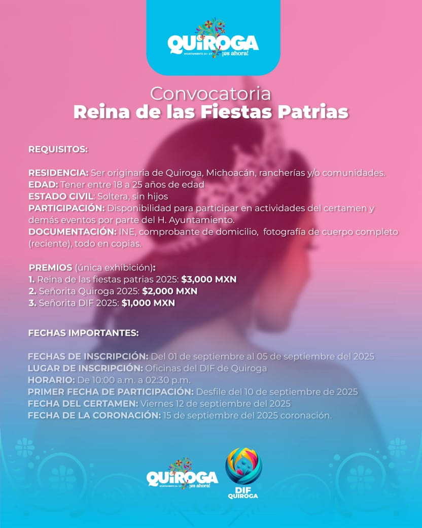 La Reina de las Fiestas Patrias 2025 obtendrá un premio de 3 mil pesos; Señorita Quiroga 2025 de 2 mil pesos y Señorita DIF 2025 mil pesos; por lo que, las interesadas podrán inscribirse del 1 al 5 de septiembre en oficinas del DIF Quiroga, en un horario de 10:00 a.m. a 2:30 p.m.