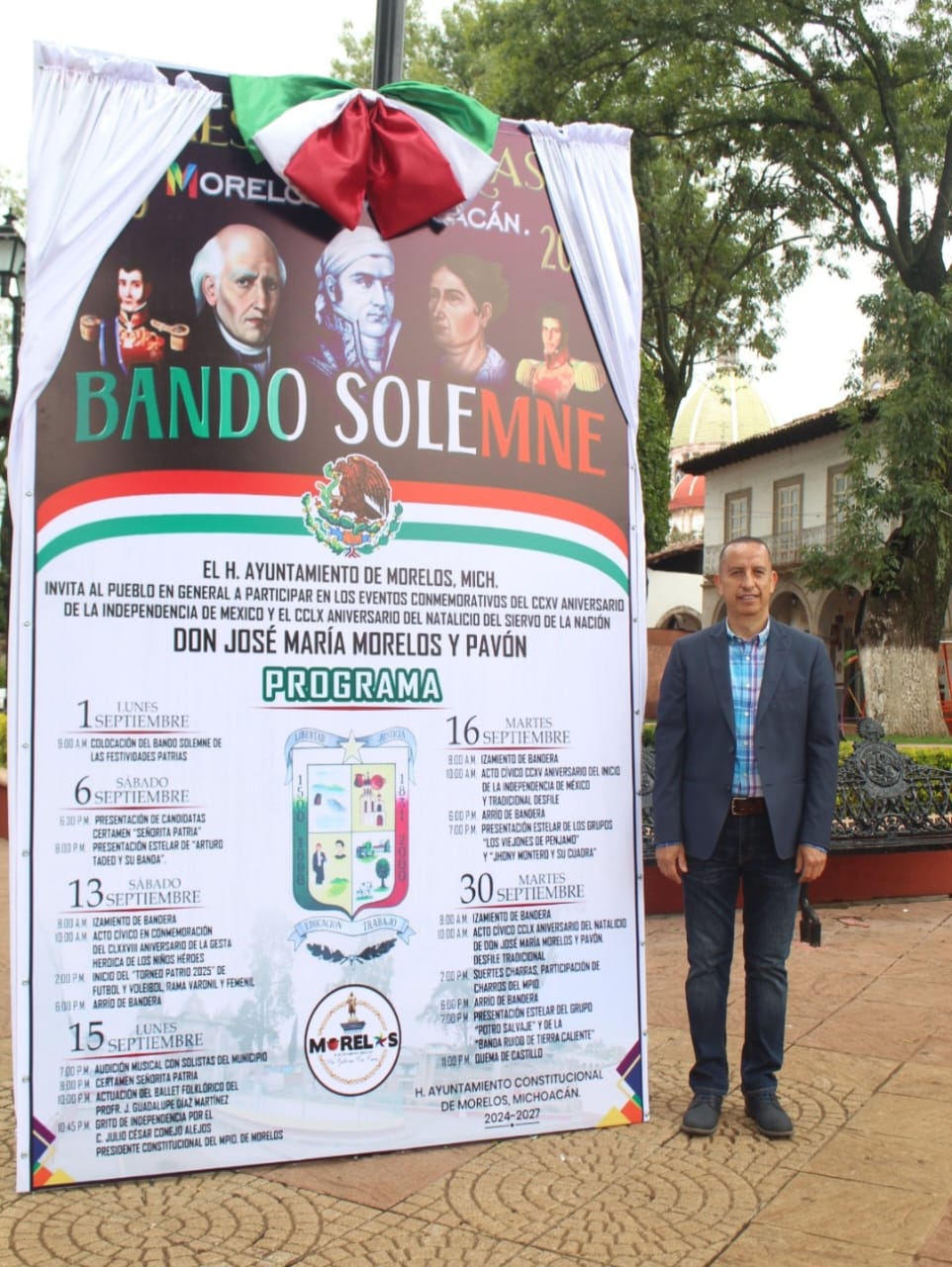 Con gran entusiasmo y en un ambiente de unidad, el presidente municipal de Morelos, Julio César Conejo Alejos, encabezó la colocación del Bando Solemne de las Fiestas Patrias, acto con el que oficialmente dieron inicio las celebraciones conmemorativas del CCXV aniversario de la Independencia de México y el CCL aniversario del natalicio de Don José María Morelos y Pavón.