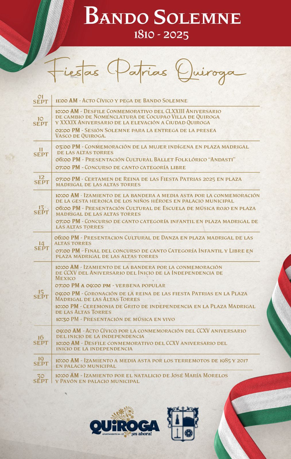 Quiroga, Michoacán .- El Ayuntamiento de Quiroga, encabezado por la presidenta municipal Alma Mireya González Sánchez, llevó a cabo la presentación del Bando Solemne, en el se informa del programa de actividades culturales, cívicas, deportivas y recreativas que se desarrollarán a lo largo de septiembre.