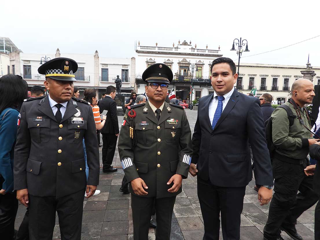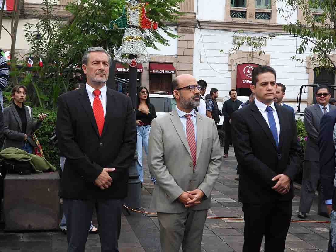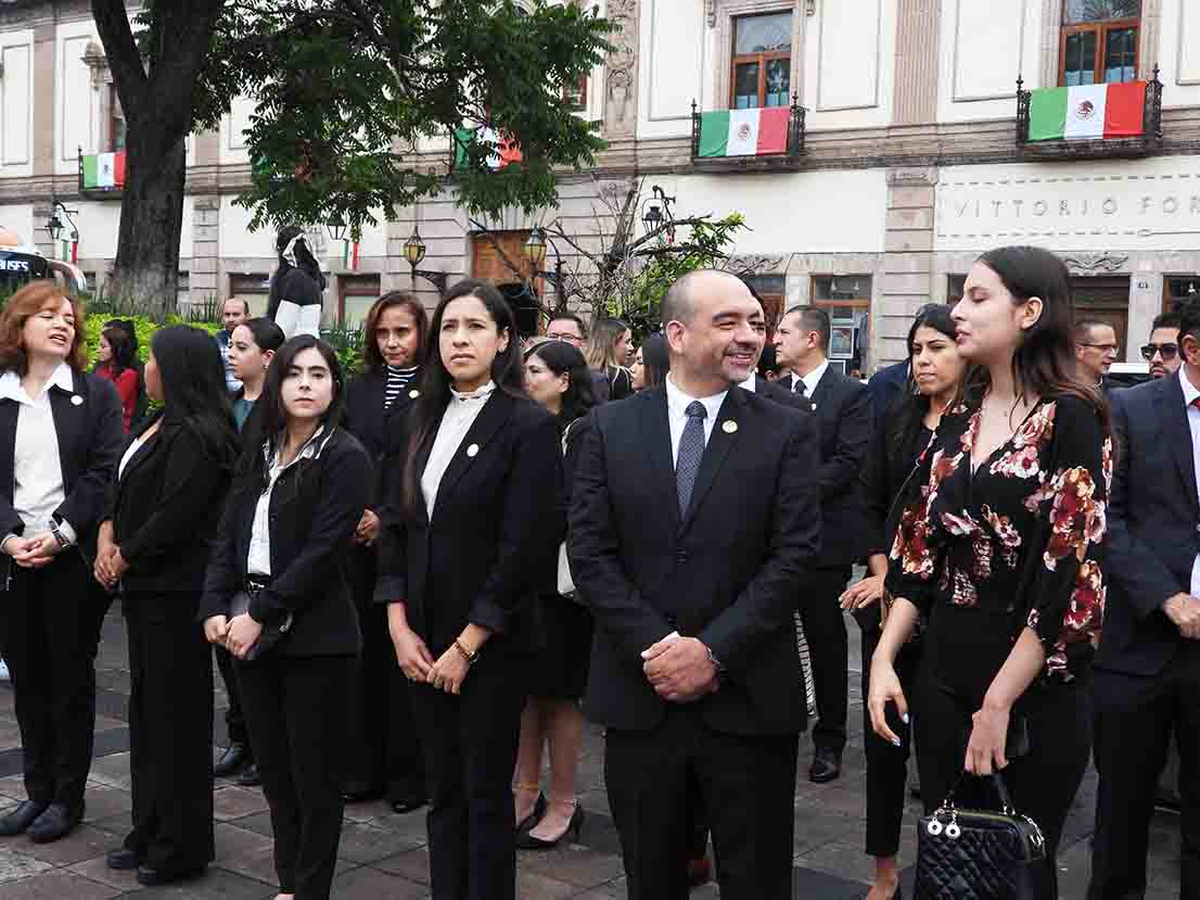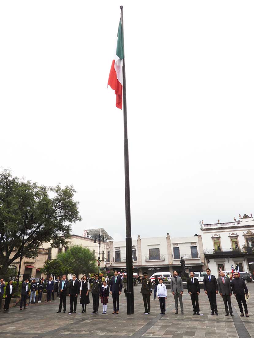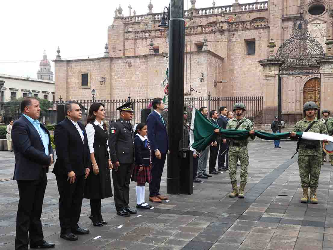 La ceremonia se desarrolló frente a la Catedral de Morelia con la participación de autoridades civiles, militares y educativas. Entre los asistentes se encontraban el Mayor de Infantería de Estado Mayor, José Luis Santos Galicia, en representación de la XXI Zona Militar; el capitán segundo de la Guardia Nacional, David Fuentes Avendaño; y Rubén Pedraza Barrera, subsecretario de Derechos Humanos del Gobierno del Estado. También estuvieron presentes integrantes del Cabildo, del gabinete municipal y del Consejo Ciudadano.