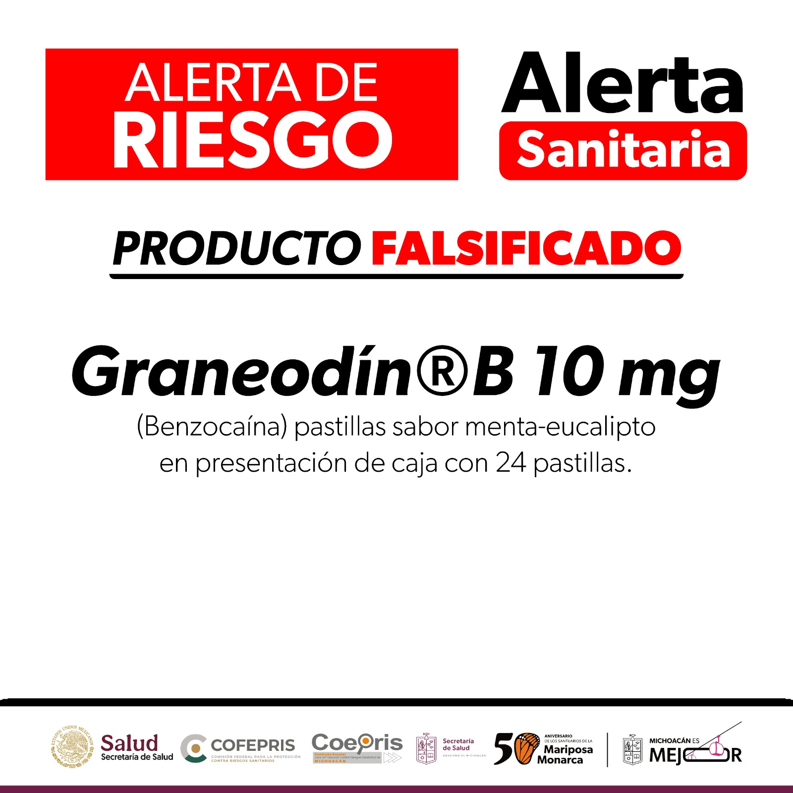La Comisión Federal para la Protección contra Riesgos Sanitarios (Cofepris) a través de la Secretaría de Salud de Michoacán (SSM), informa a la población en general sobre la detección de un lote falsificado del producto Graneodín®️B 10 mg (Benzocaína) pastillas sabor menta-eucalipto, en presentación de caja con 24 pastillas.