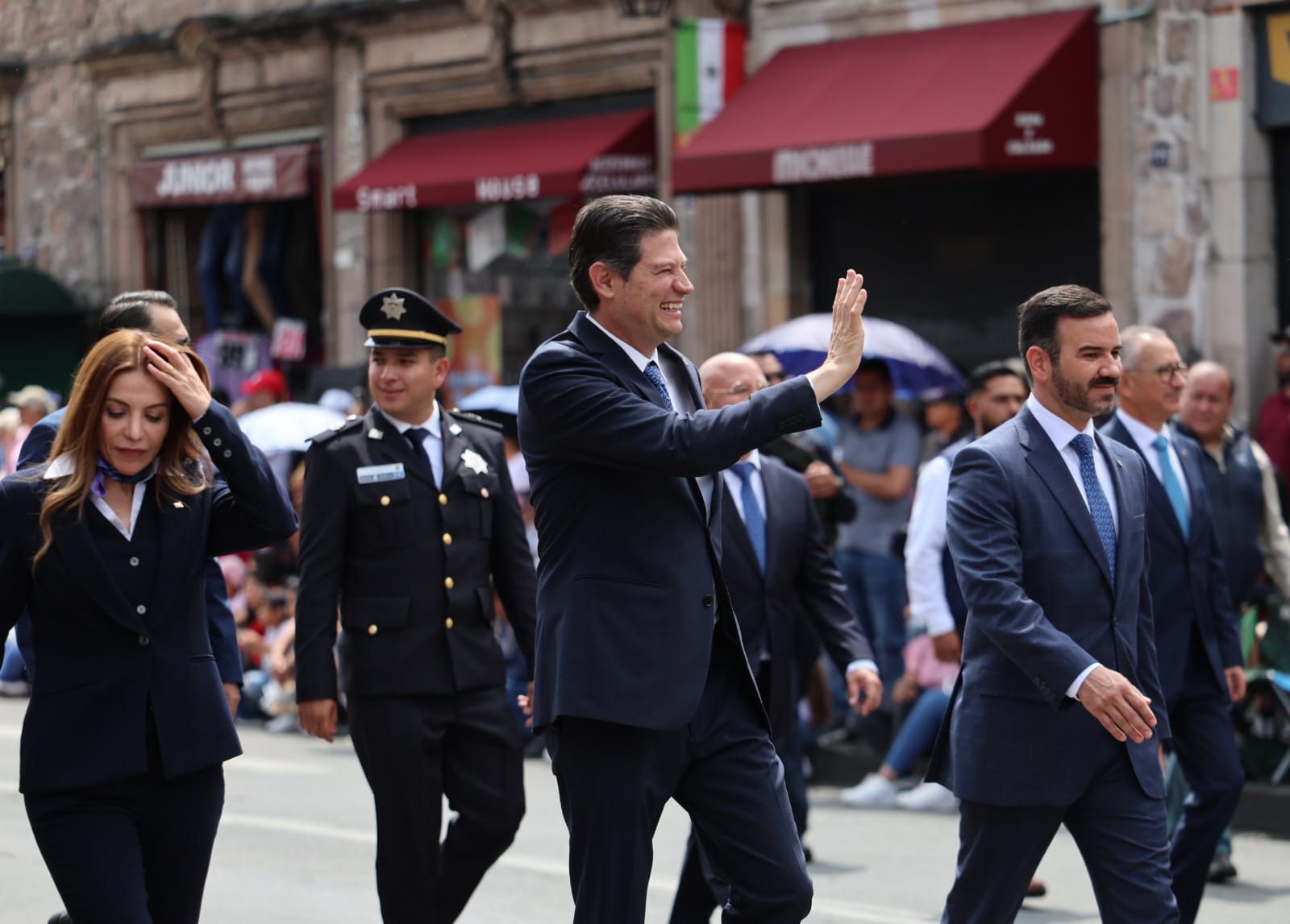 Acompañado por integrantes del Ayuntamiento, funcionarios y funcionarios del Gabinete, y la escolta del municipio, el Alcalde encabezó el desfile y abrió paso a la participación de escuelas de nivel básico, telebachillerato, instituciones privadas, y la Universidad Michoacana de San Nicolás de Hidalgo, así como agrupamientos de la Guardia Nacional, Guardia Civil y Policía Morelia, que marcharon a bordo de patrullas y motocicletas.