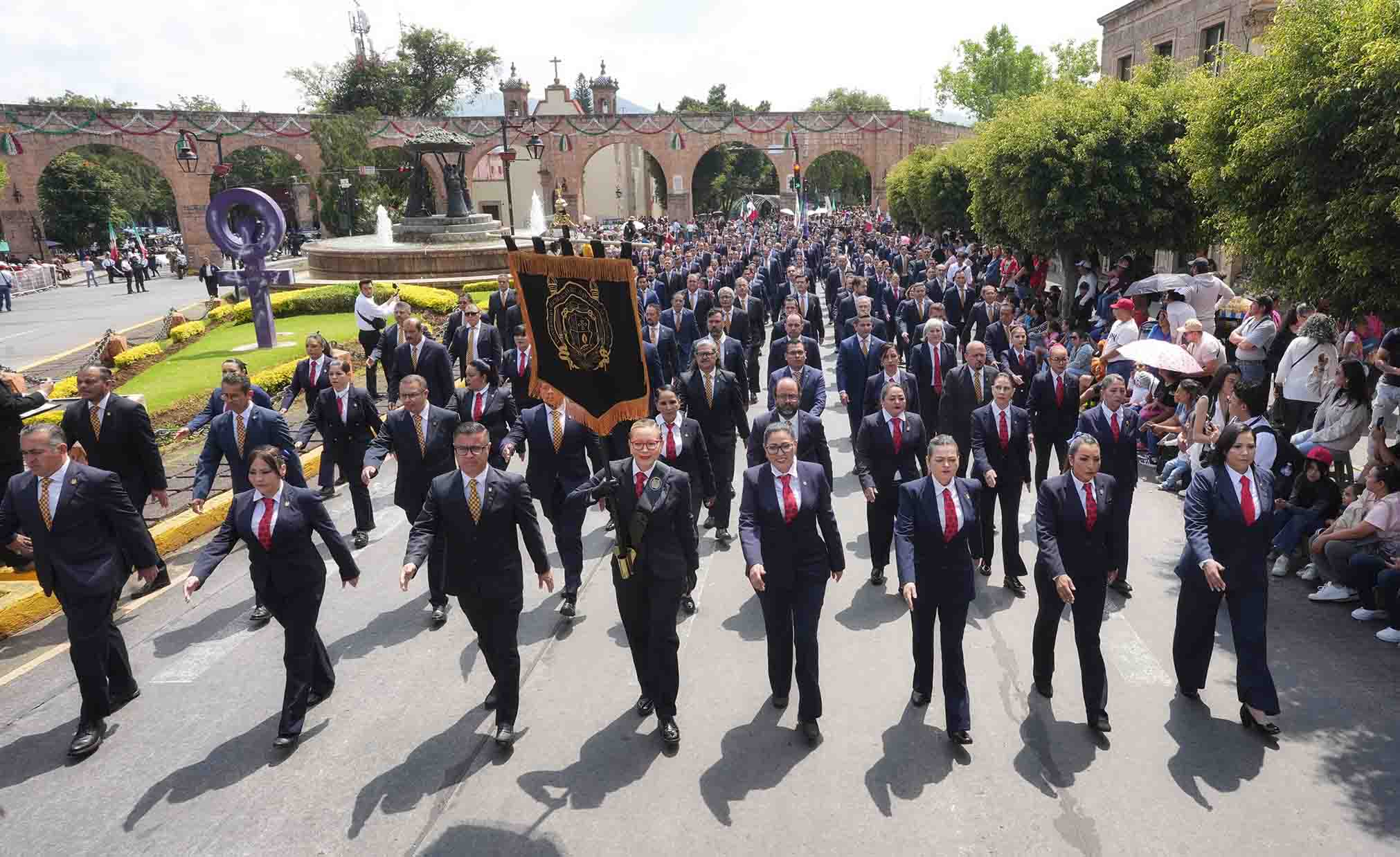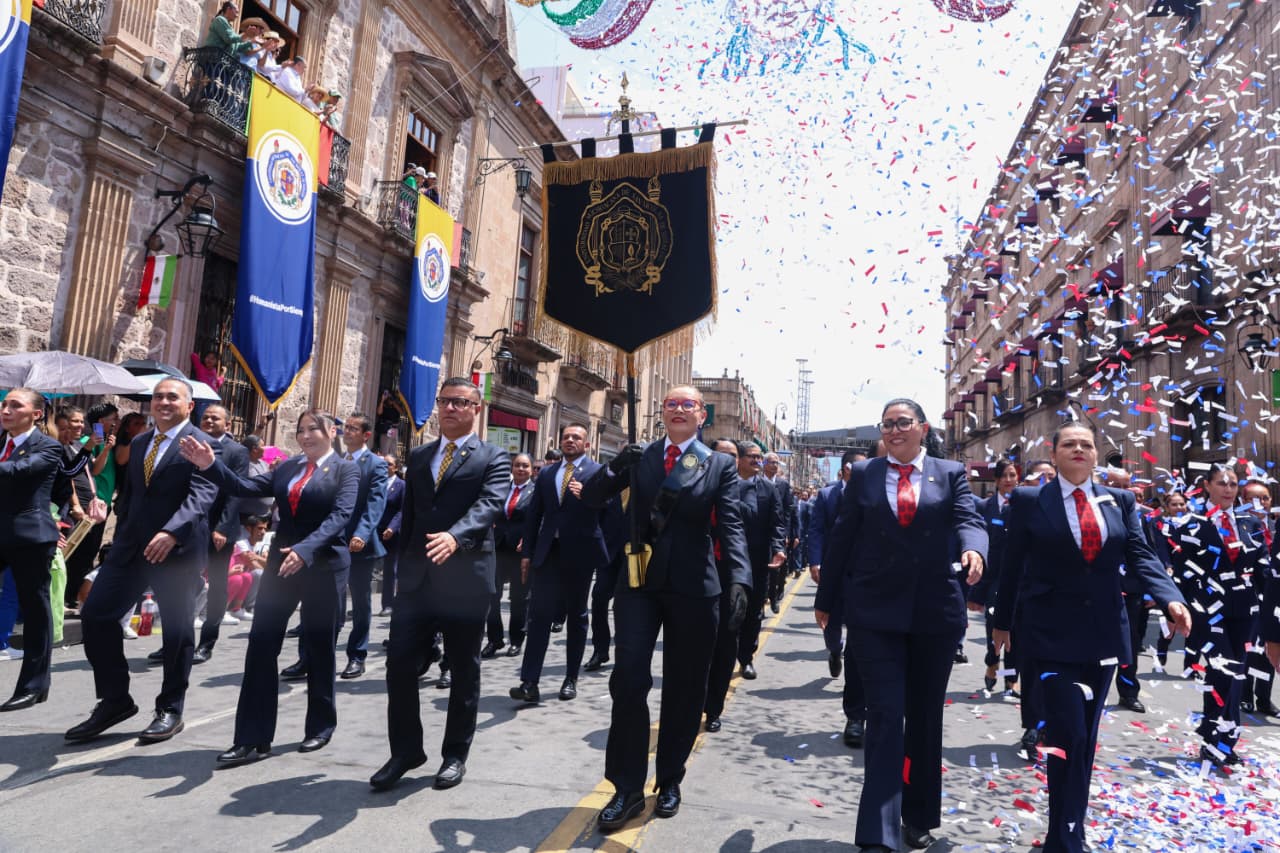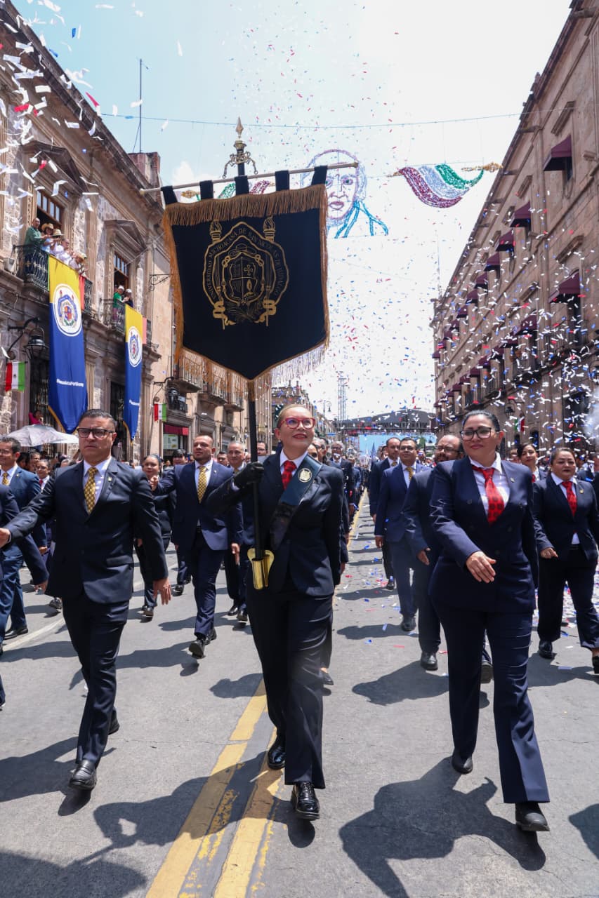 Con paso firme y entre aplausos del público, el contingente de la UMSNH integrado por cerca de 800 elementos entre funcionarias, funcionarios, directoras y directores de escuelas, facultades e institutos, consejeros universitarios, docentes, estudiantes e integrantes de la galardonada Banda de Guerra recorrieron la Avenida Madero haciendo vibrar el corazón del Centro Histórico de Morelia con la historia, juventud y orgullo académico que representa la Máxima Casa de Estudios.