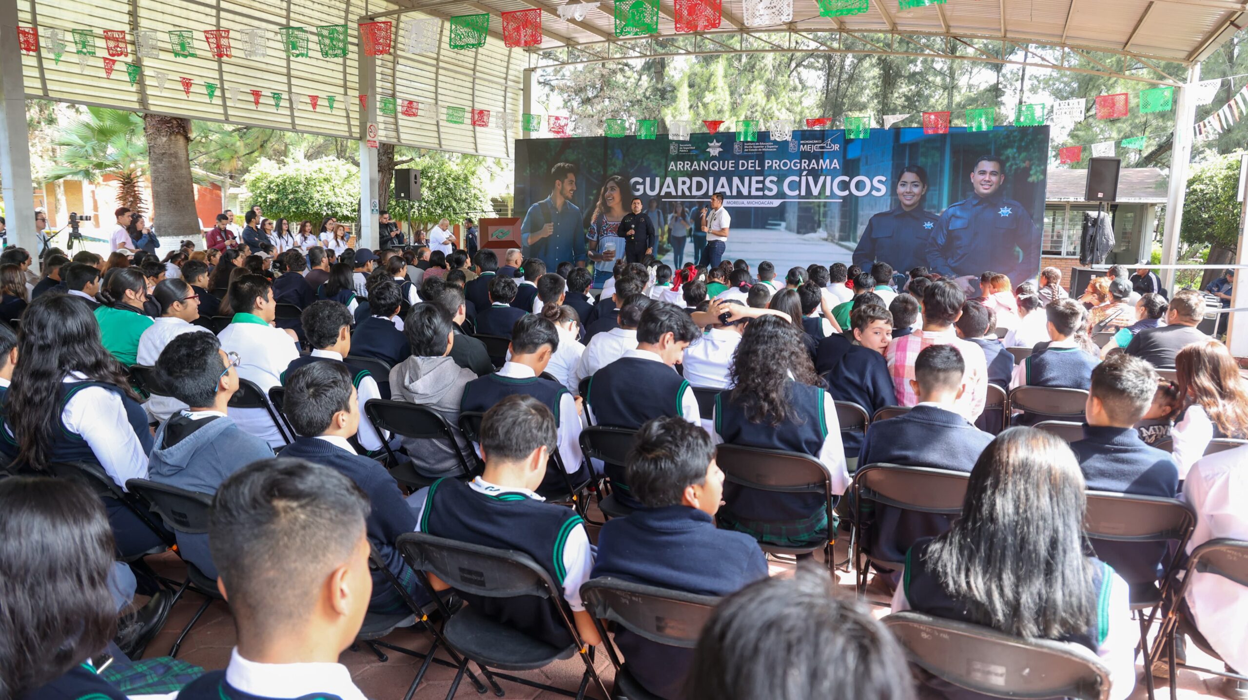 Morelia, Michoacán, 19 de septiembre de 2025.- La Secretaría de Seguridad Pública (SSP), en conjunto con el Instituto de Educación Media Superior y Superior del Estado de Michoacán (Iemsysem), dieron arranque al programa “Guardianes Cívicos”, estrategia encaminada a reforzar la proximidad social y fomentar la cultura cívica entre la población educativa.