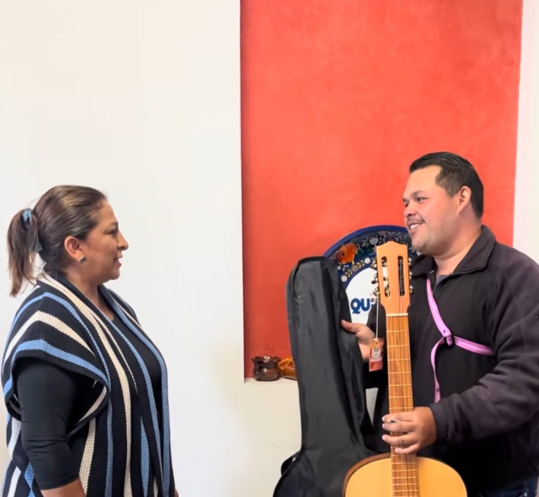 Quiroga, Michoacán.– Hoy, la presidenta municipal de Quiroga, Alma Mireya González Sánchez, respaldó a un joven talentoso de la comunidad de Icuácato, entregándole una guitarra acústica después de que la suya se descompusiera, acciones que se realizan de manera constante para impulsar a las y los quiroguenses.