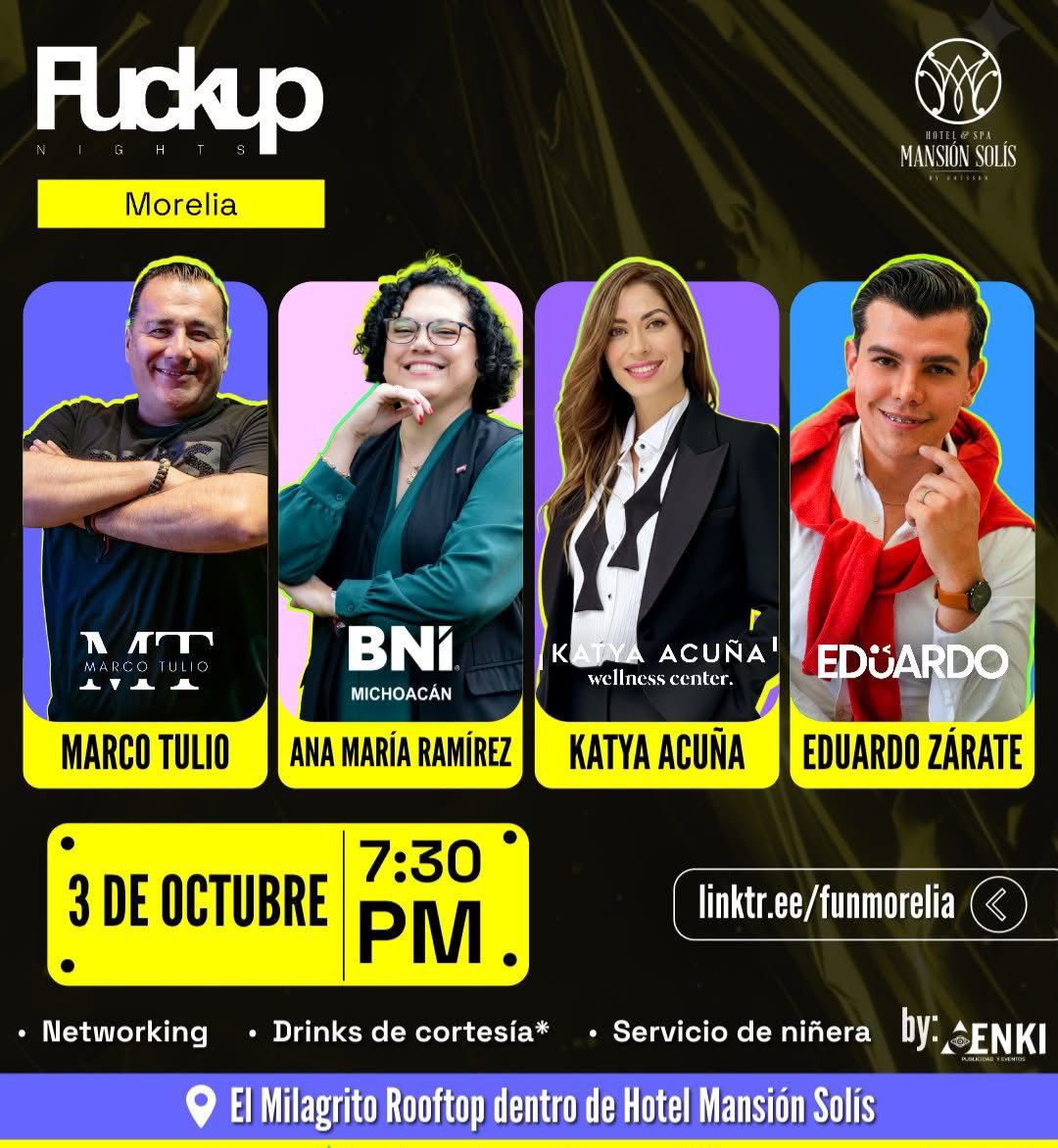 Además, el evento contará con networking, servicio de niñeras gratis y bebidas de cortesía para los primeros 100 asistentes. Los boletos se encuentran disponibles hasta el 28 de septiembre; para más informes, las personas interesadas pueden visitar la página https://www.fuckupnights.com/.