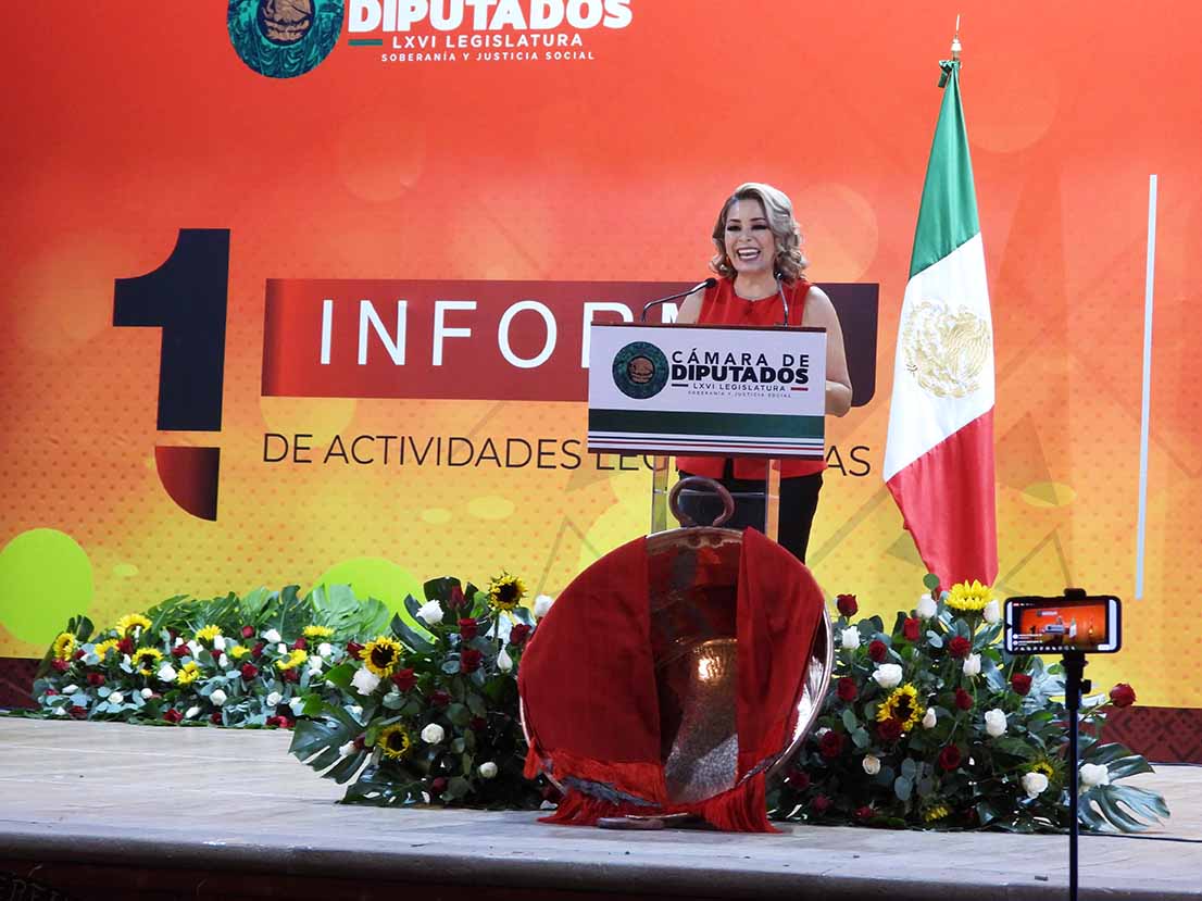 El informe incluyó un repaso de las reformas constitucionales aprobadas, entre ellas las relacionadas con pueblos indígenas, la Guardia Nacional, salarios mínimos, derechos de jóvenes, vivienda, protección de maíces nativos, igualdad sustantiva, soberanía nacional y simplificación administrativa. La legisladora afirmó que esas decisiones marcan el rumbo del país.