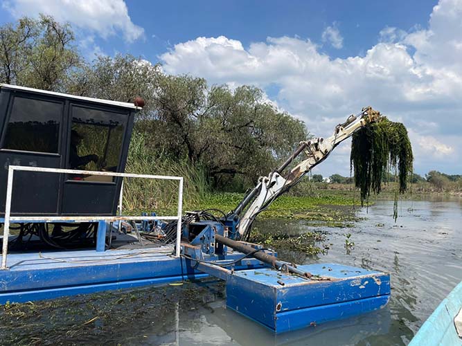 Con maquinaria especializada retira más de mil metros cubicos de tule, carrizo y lirio acuático.