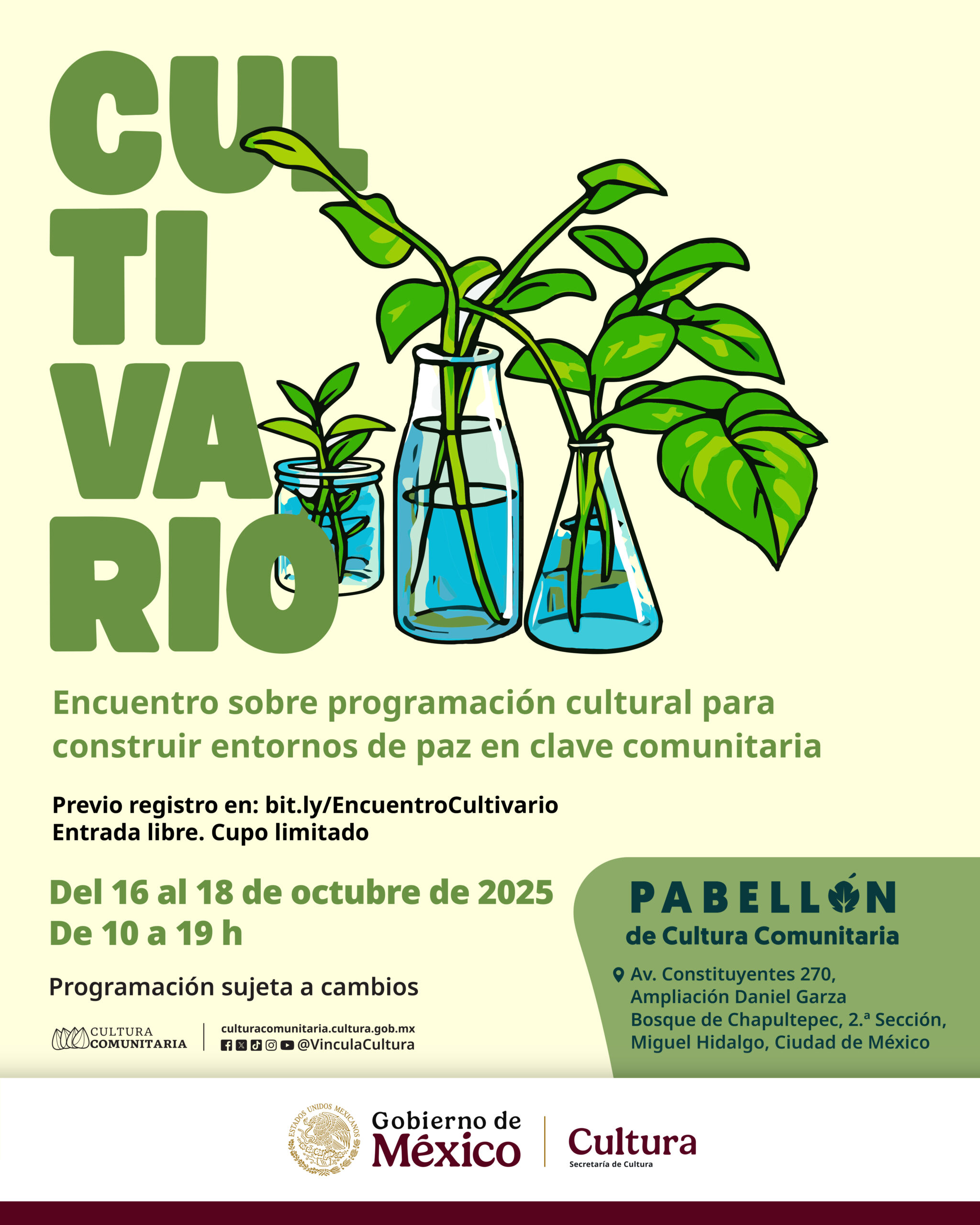 La Secretaría de Cultura del Gobierno de México, a través de la Dirección General de Vinculación Cultural (DGVC) y la Dirección de Animación Cultural, convoca a “Cultivario. Encuentro sobre programación cultural para construir entornos de paz en clave comunitaria”, que se realizará del 16 al 18 de octubre de 2025 en el Pabellón de Cultura Comunitaria, en la Ciudad de México.