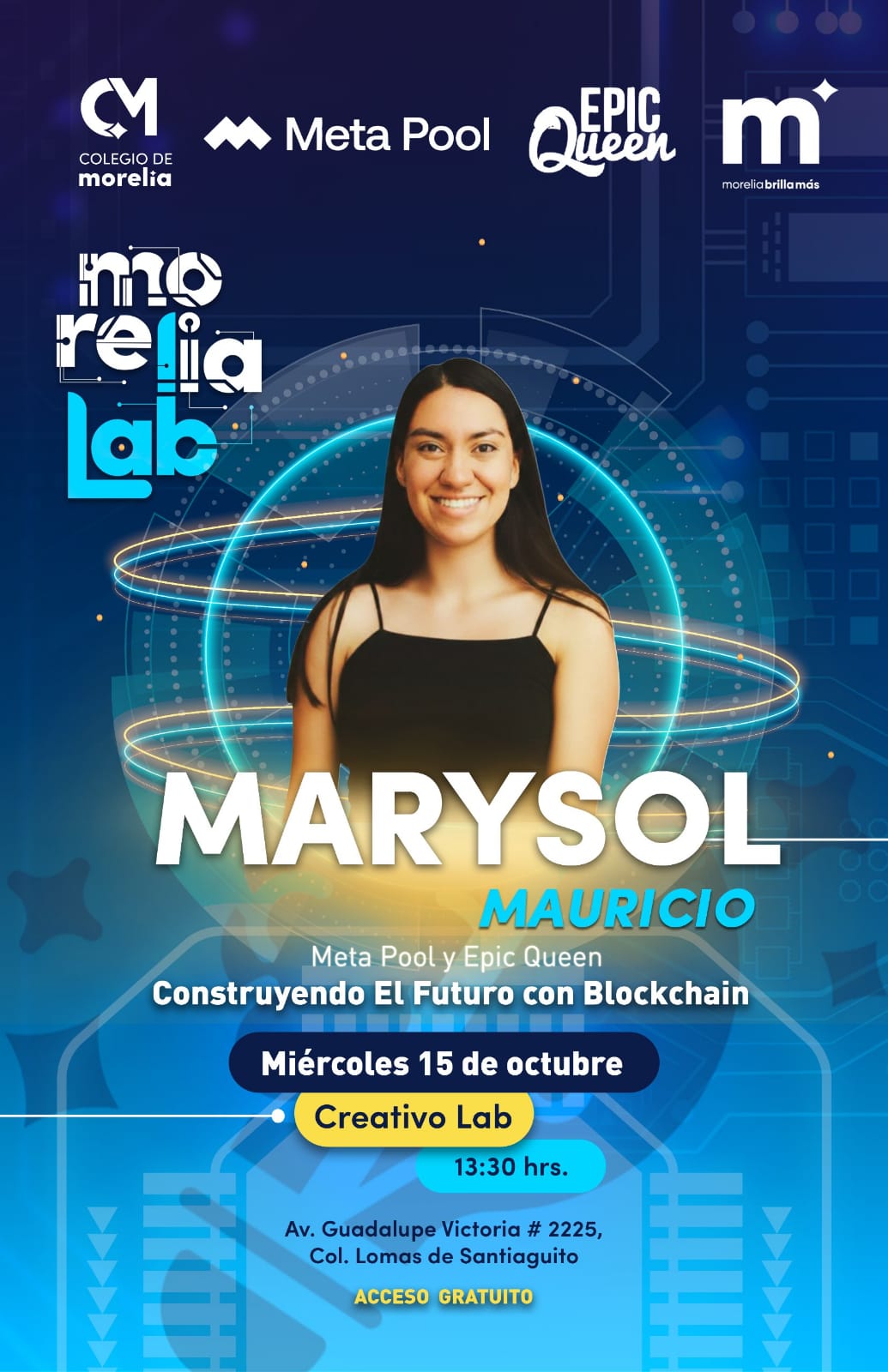 Marysol Mauricio actualmente impulsa iniciativas en Epic Queen, Vara Network y Meta Pool, y forma parte de Web3 Gals, acercando blockchain a nuevas audiencias con énfasis en mujeres y jóvenes.