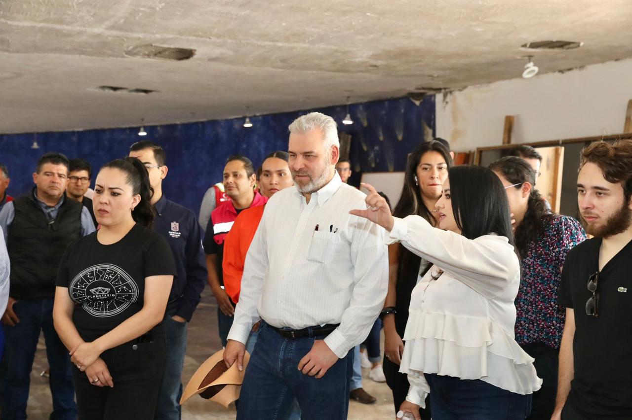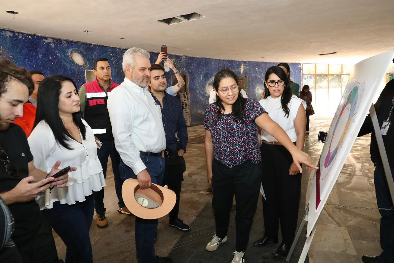 La secretaria explicó al gobernador los trabajos terminados como la demolición en fachadas, aulas de idiomas, oficinas administrativas, auditorio, pasillo de servicio, casa de la tierra, entre otras áreas; el desmontaje de la sala de proyección, que mantendrá el domo original. Así como los que se encuentran en proceso.