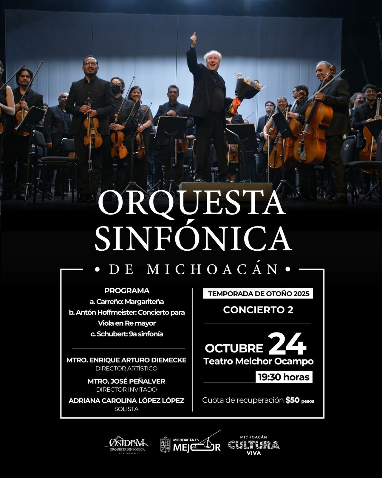 La Secretaría de Cultura de Michoacán (Secum) invita al público a disfrutar del segundo concierto de la Temporada de Otoño 2025 de la Orquesta Sinfónica de Michoacán (Osidem). La cita es el viernes 24 de octubre, a las 19:30 horas, en el Teatro Melchor Ocampo, con cuota de recuperación de 50 pesos.