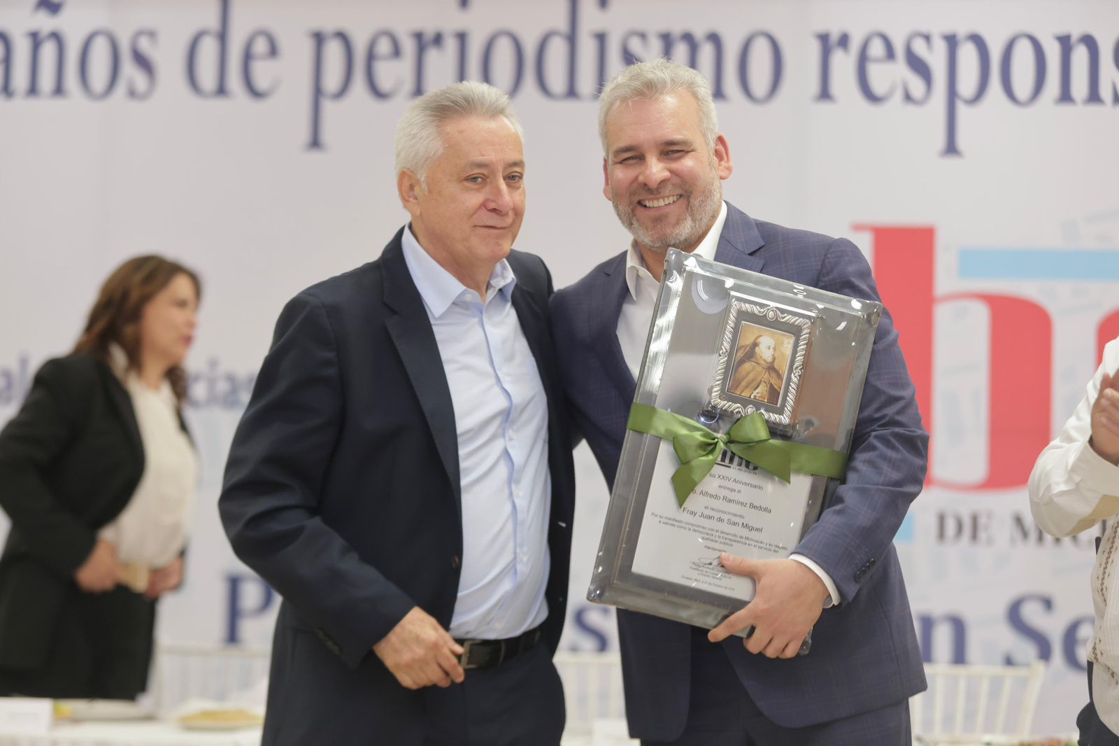 Uruapan, Michoacán.- El gobernador Alfredo Ramírez Bedolla recibió el reconocimiento Fray Juan de San Miguel, que entrega cada año el periódico ABC de Michoacán en el marco de su aniversario, de manos de su presidente y director general, Pedro Andrade González.