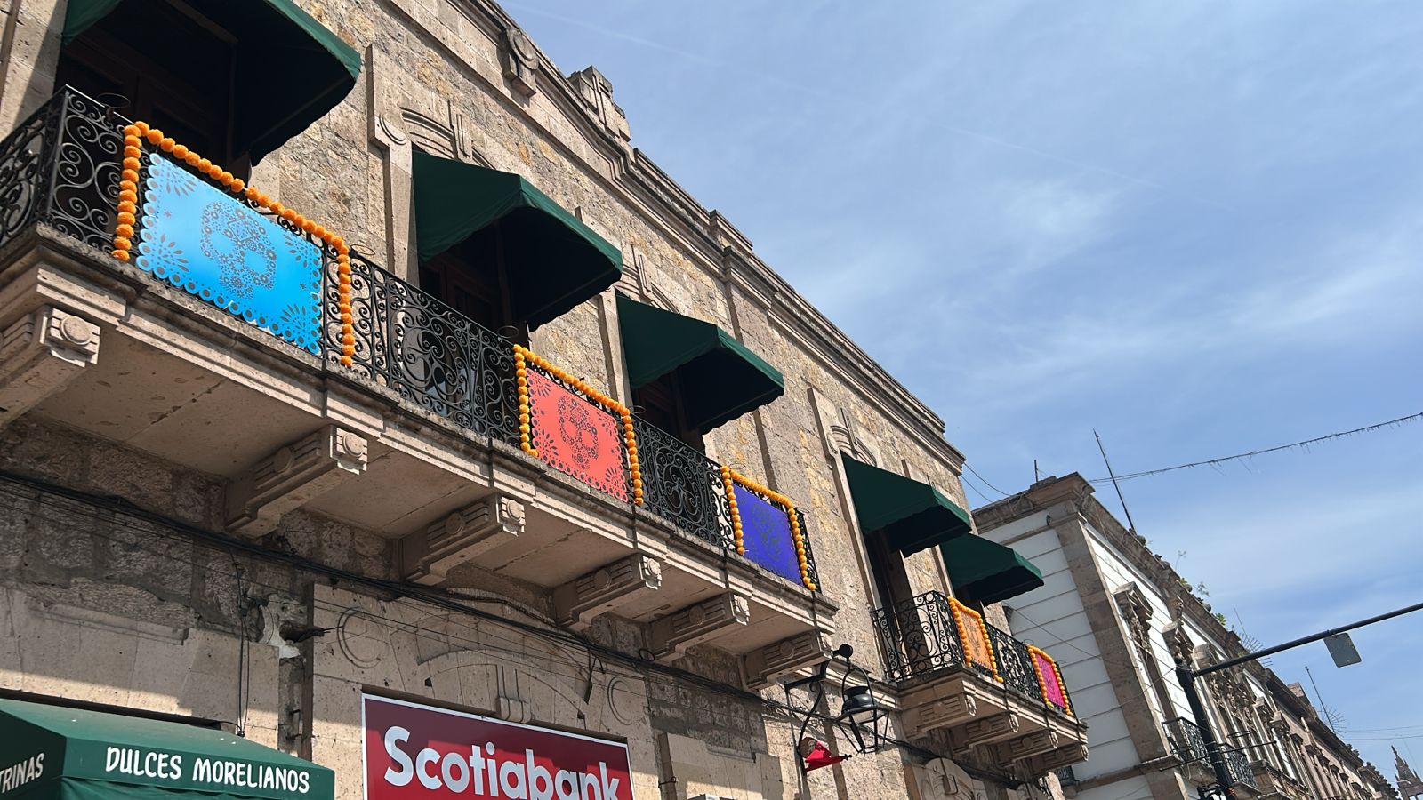 La secretaria de Turismo, Thelma Aquique Arrieta, informó que en el Centro Histórico de Morelia ya se pueden disfrutar de exhibiciones y decoraciones propias de la temporada. Espacios como la calle peatonal El Nigromante, la plaza Natalio Vázquez Pallares, el Bosque Cuauhtémoc, la Calzada Fray Antonio de San Miguel, la Cerrada de San Agustín, la Plaza Valladolid, y el Palacio Municipal, se convierten en vistosos escenarios de color con catrinas, catrines y cráneos gigantes, que rinden homenaje a nuestras raíces.
