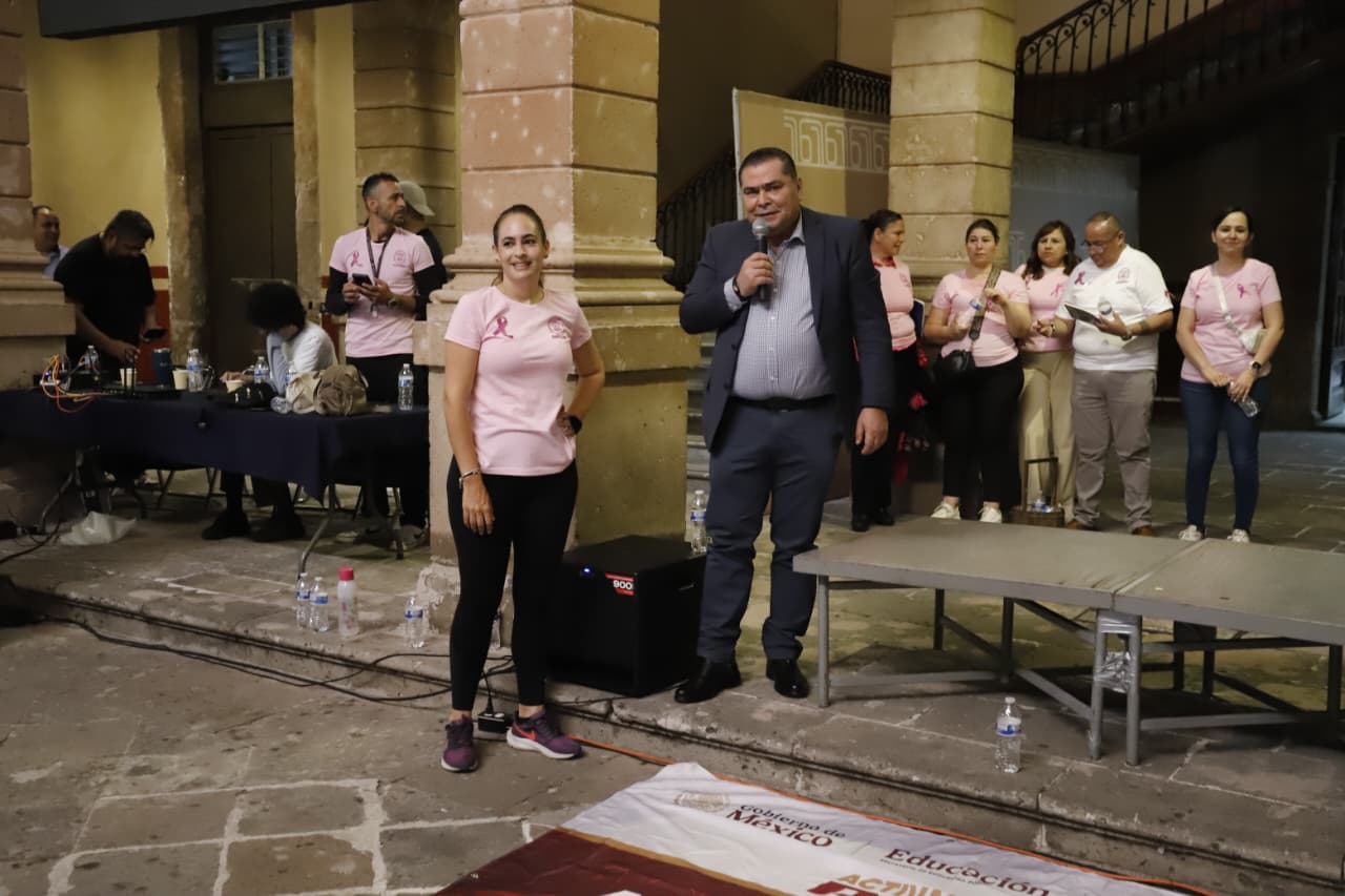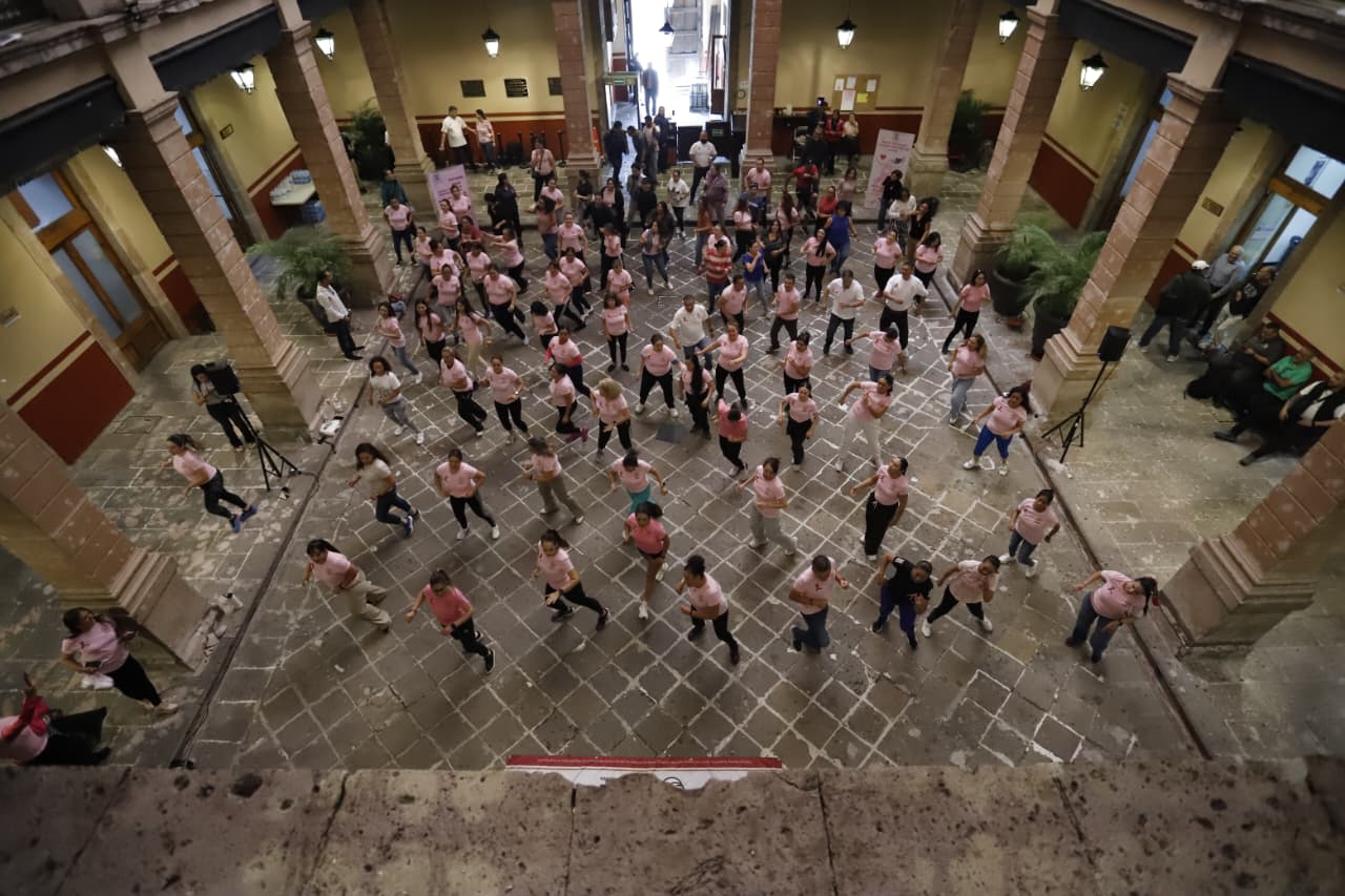El patio central del Congreso del Estado se vistió de rosa al desarrollarse una jornada de activación física con las y los trabajadores del Poder Legislativo, como parte de la Feria de la Salud contra el cáncer de mama que organizan conjuntamente el Poder Legislativo y el STASPLE con la finalidad de concientizar al personal sobre la importancia de prevenir dicha enfermedad.