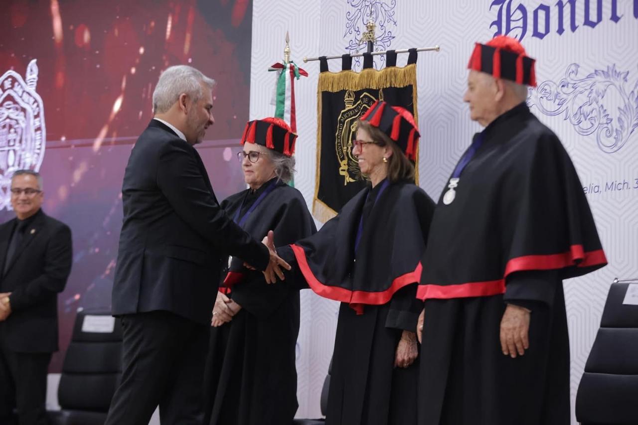 El gobernador Alfredo Ramírez Bedolla asistió a la ceremonia de investidura donde la Universidad Michoacana de San Nicolás de Hidalgo (UMSNH) distinguió con el doctorado “honoris causa” a Catherine Rose Ettinger Mc Enulty, Annie Pardo Cemo y Gerardo Sánchez Díaz.