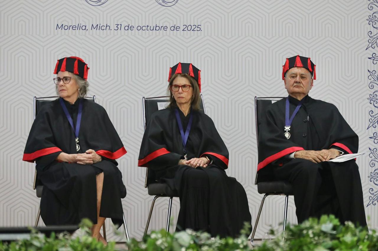 “Participar en este acto solemne es motivo de profundo honor y emoción. No solo honra sus trayectorias, sino que también reafirma el compromiso de la Universidad Michoacana con el conocimiento, la igualdad y la libertad de pensamiento. Mi compromiso con la Universidad se refleja en la reforma constitucional de noviembre de 2024 donde se le otorga autonomía plena”, dijo.