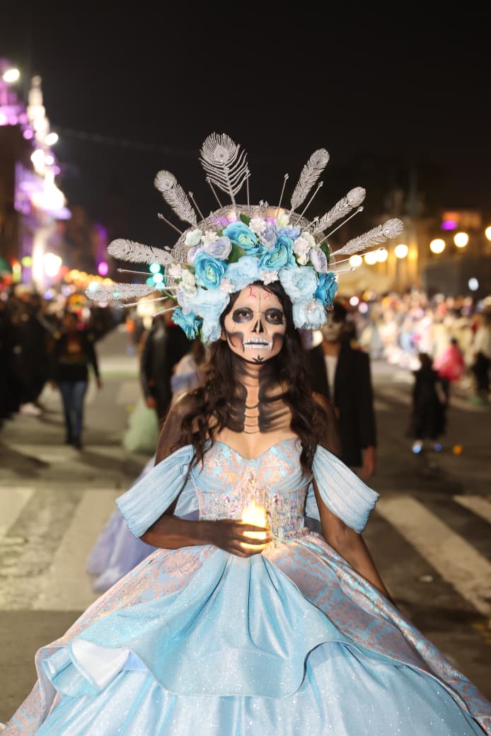 Sobre la avenida Madero, en el corazón de la capital, miles de catrinas y catrines desfilaron mostrando sus más elegantes prendas. Algunos de ellos, portaban sombreros, veladoras y coronas de cempasúchil.