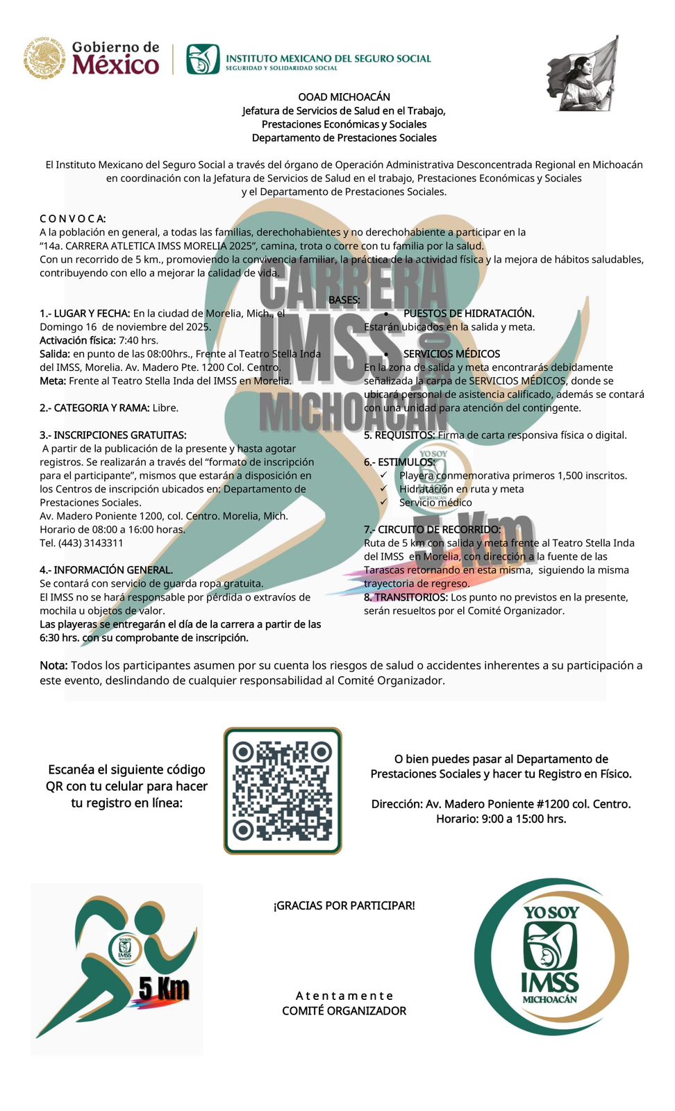 Este evento está enfocado a familias, adultos, jóvenes e infantes, quienes podrán caminar, trotar o correr 5 kilómetros, con salida en el Teatro “Stella Inda” del Instituto, para proseguir por la principal ruta de Morelia, cruzar por la Catedral, llegar al Monumento a “Las Tarascas” y regresar al punto de inicio en las oficinas de la representación del Seguro Social en el estado.