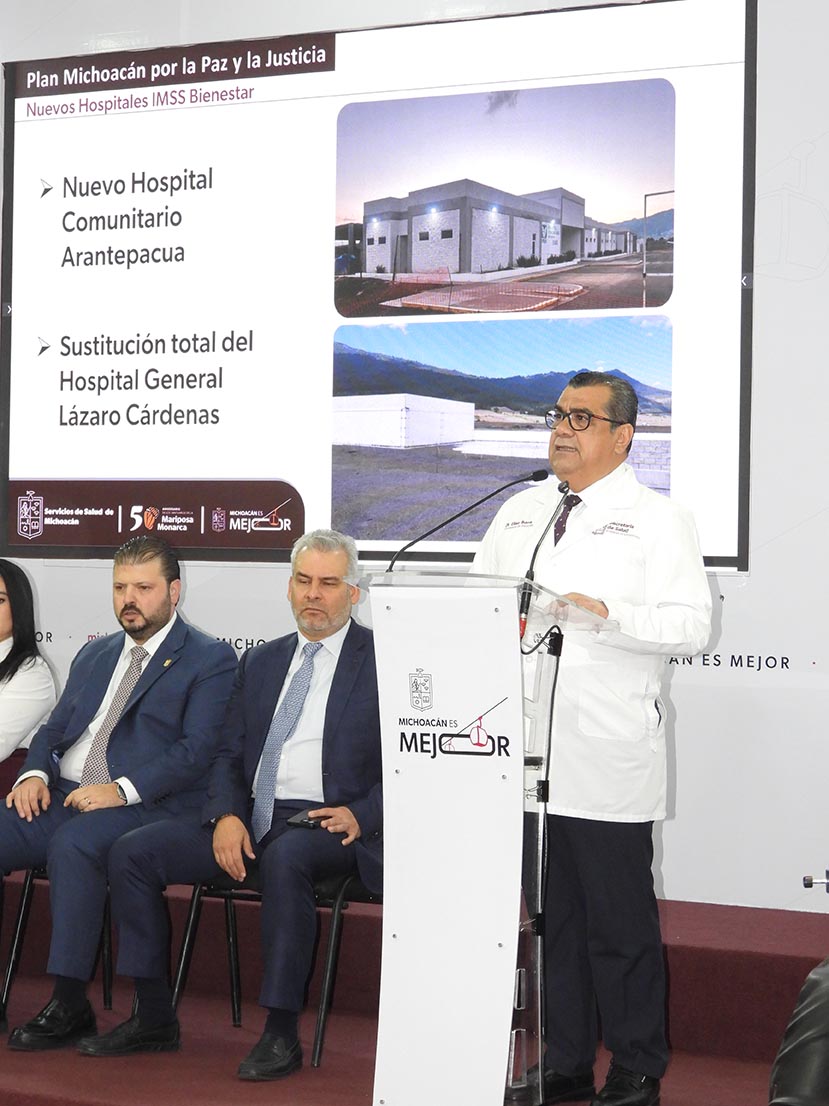 El secretario de Salud detalló que también serán reconvertidos 7 hospitales rurales en hospitales de zona, en las localidades de Paracho, Villamar, Ario de Rosales, Buenavista, Huetamo, Tuxpan y Coalcomán, y se ampliarán las especialidades y servicios del nuevo Hospital de Uruapan.