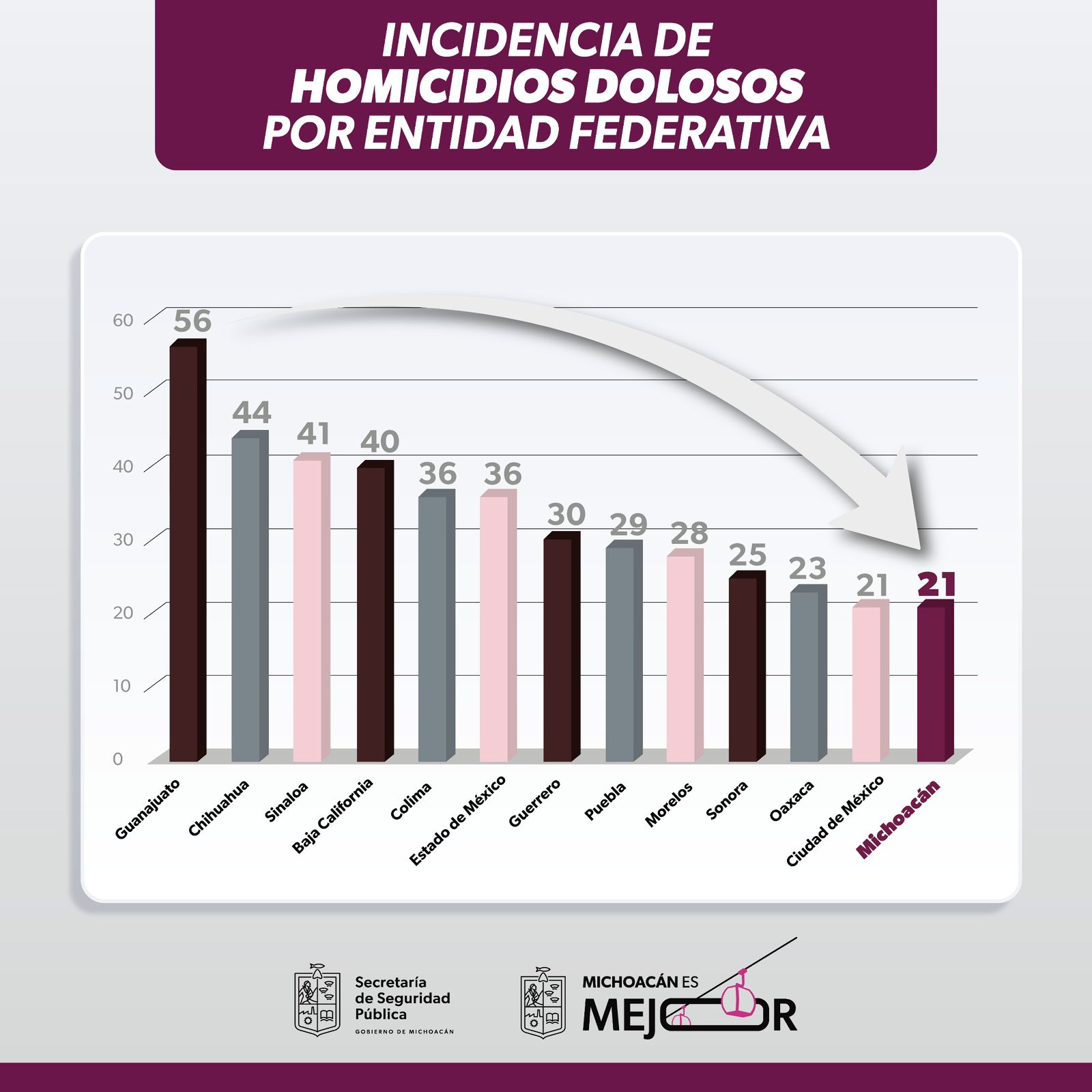 De acuerdo con el reporte nacional de este miércoles, Michoacán salió de los primeros 10 estados con más casos de homicidio doloso, colocándose en la posición número 13.