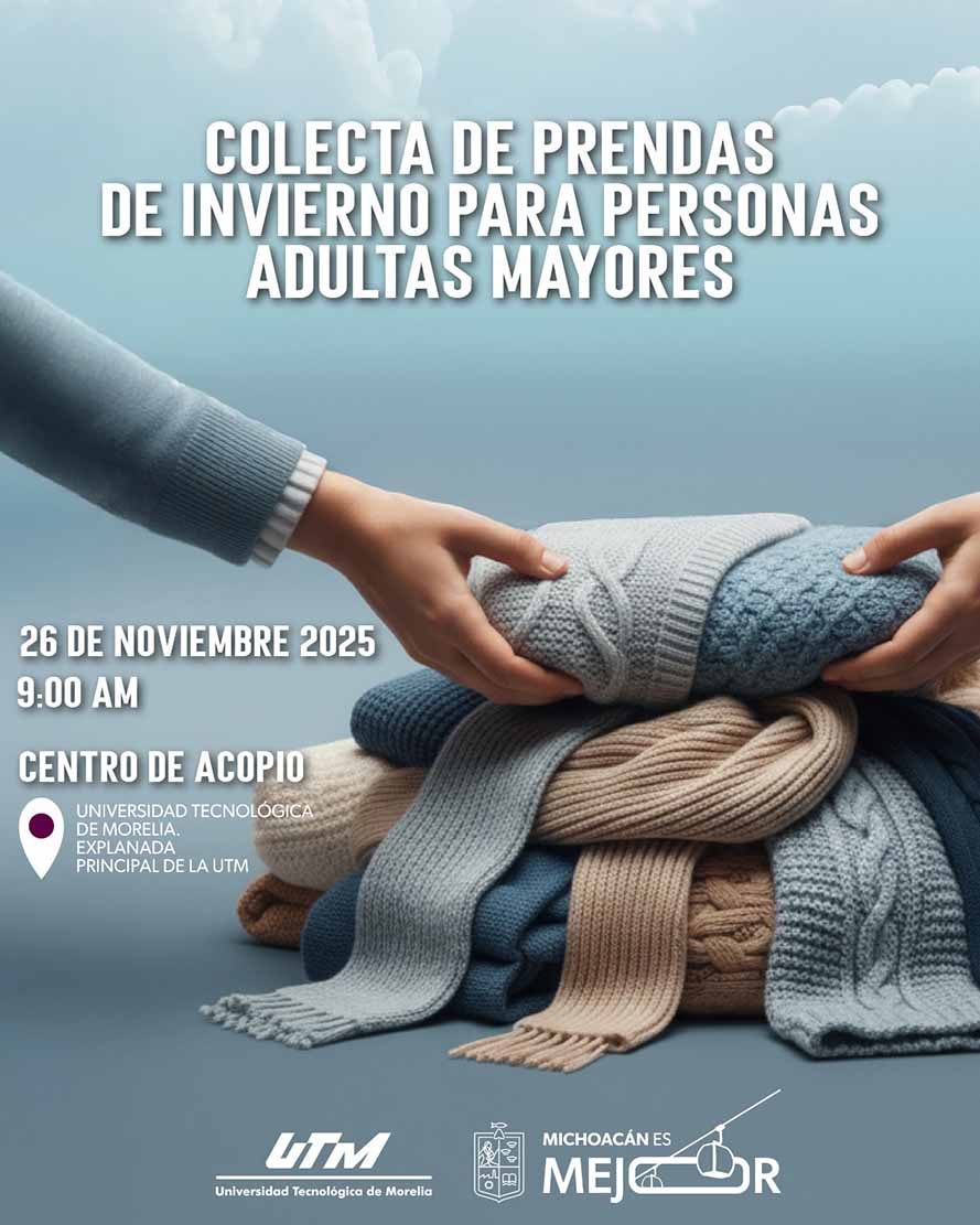 La Universidad Tecnológica de Morelia llevará a cabo una colecta de prendas invernales destinadas al refugio Cristo Abandonado, como parte del servicio social de estudiantes de la Ingeniería en Diseño y Moda Industrial. La actividad tiene el propósito de reunir ropa y artículos para reforzar el apoyo a personas adultas mayores.