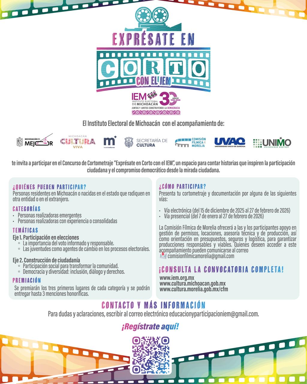 La convocatoria “Exprésate en Corto con el IEM” permanecerá abierta hasta el 27 de febrero de 2026 y puede consultarse en la página oficial del Instituto Electoral de Michoacán, así como en las redes sociales de la Secretaría de Cultura de Morelia y de la Comisión Fílmica municipal.