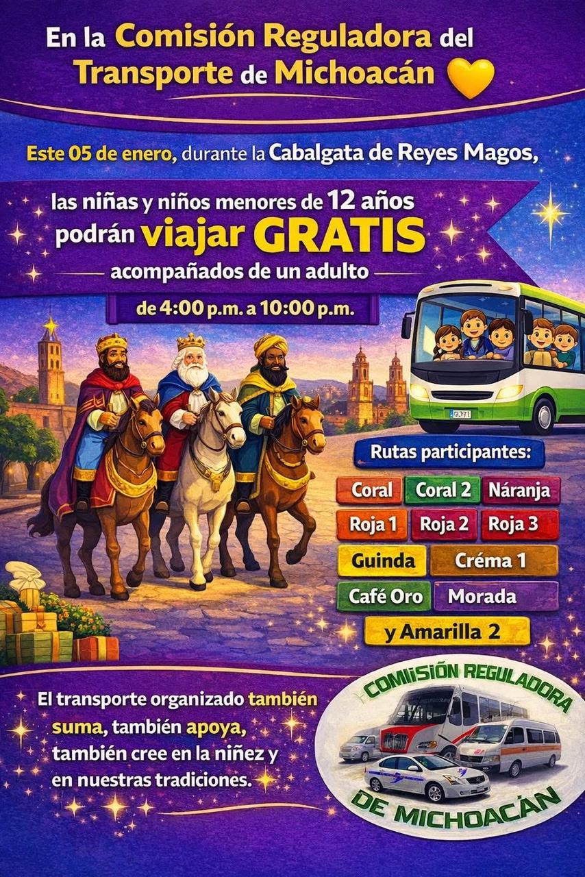 Con motivo de la Cabalgata de Reyes Magos, el Gobierno de Morelia, encabezado por el Presidente Municipal Alfonso Martínez Alcázar, en coordinación con la Comisión Reguladora de Transporte (CRT), ofrecerá transporte público gratuito para niñas y niños menores de 12 años este próximo 05 de enero.