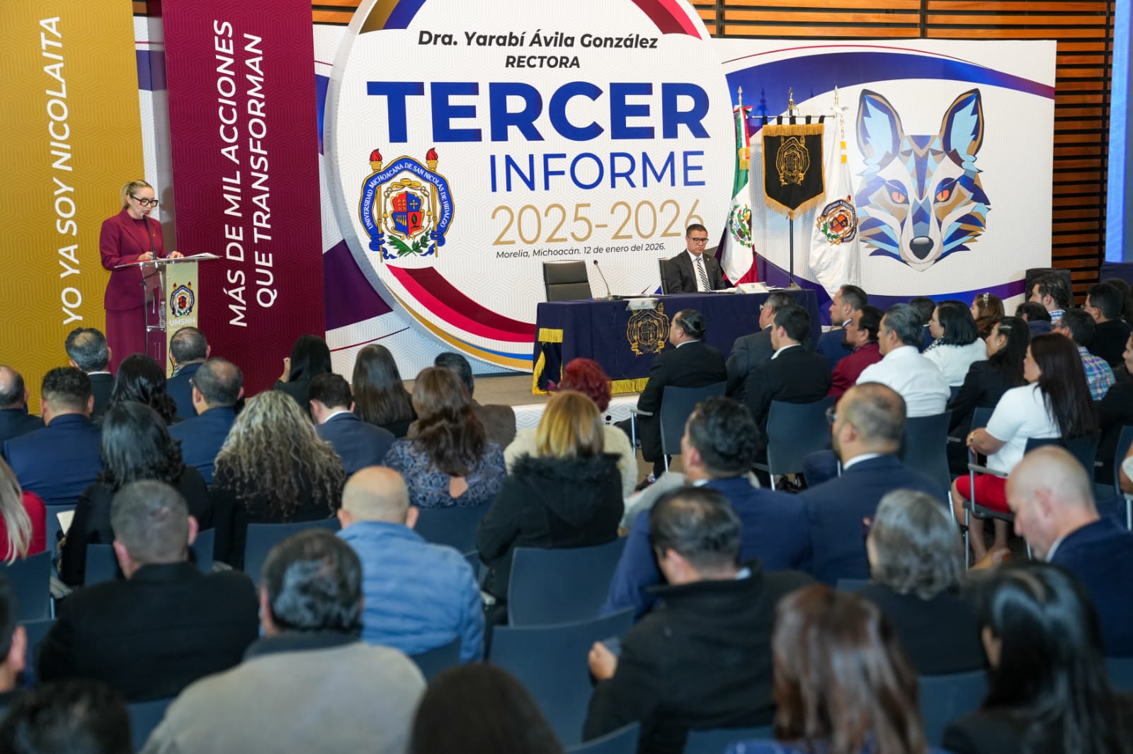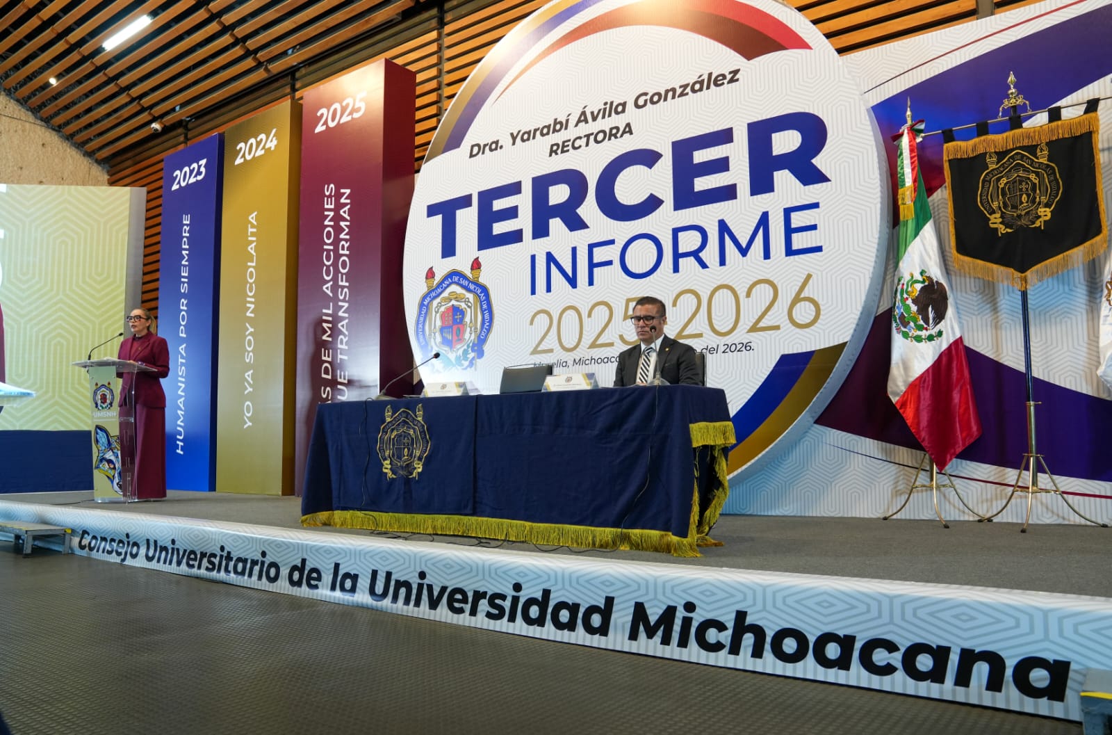“La Universidad Michoacana de San Nicolás de Hidalgo (UMSNH) que recibimos estaba de pie, pero tambaleante. La Universidad que hoy presentamos está firme, con rumbo y futuro sustentable”, afirmó la rectora Yarabí Ávila González, al presentar su Tercer Informe de Actividades ante el Consejo Universitario.
