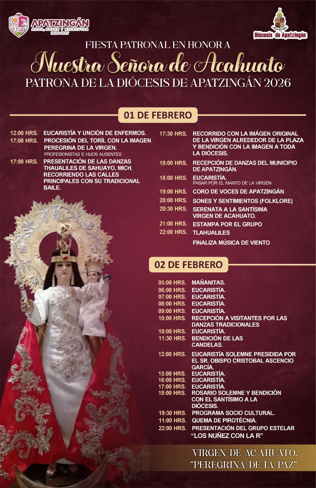 Además, el seminarista Emanuel Flores Guzmán rememoró que esta tradición, iniciada en el siglo XVI, ha evolucionado hasta convertirse en las fiestas actuales. Los organizadores detallaron que, de forma paralela al evento religioso, se realizará una peregrinación ciclista el 1 de febrero a las 18:30 horas, partiendo de la entrada principal del Palacio Municipal. Todos los pormenores pueden consultarse en la página de Facebook: Gobierno de Apatzingán.