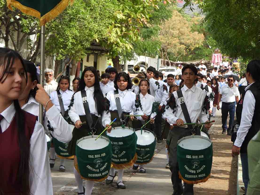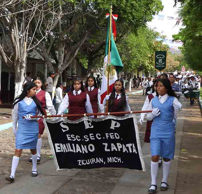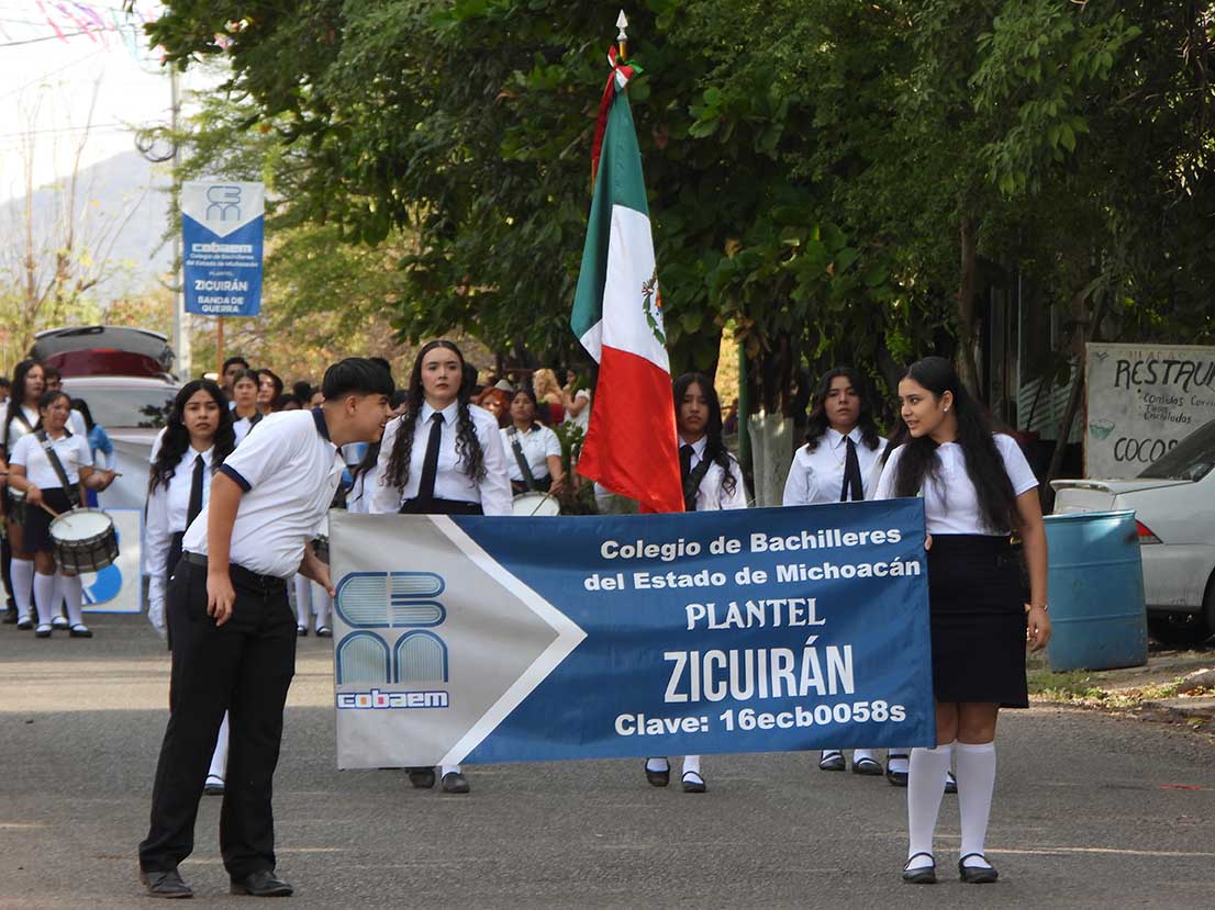 La fiesta en Zicuirán comenzó por la mañana, con el tradicional desfile con el que se conmemora el aniversario del Ejido de Zicuirán. Autoridades ejidales, civiles, educativas y sectores sociales como comerciantes y mujeres emprendedoras recorren las principales calles de esta tenencia perteneciente a La Huacana y en el cual participan contingentes de otros municipios como Gabriel Zamora y Múgica, entre otros.