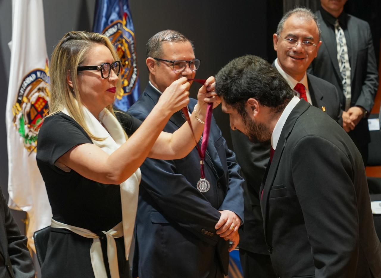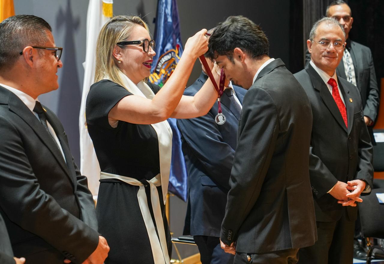 En representación de las egresadas y egresados que recibieron la medalla, Jorge Miguel Santacruz, compartió que este reconocimiento no es ùnicamente un mérito individual es en realidad el reflejo de un proceso formativo riguroso, exigente y profundamente humano, “que se construye dia a dia en las aulas, laboratorios, clínicas y espacios académicos de nuestra Universidad”. Agregó que el obtenerlo implica un compromiso renovado, ejercer la profesión con ética, seguir produciendo conocimientos de calidad y contribuir activamente al desarrollo científico, social y humano.